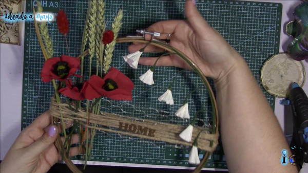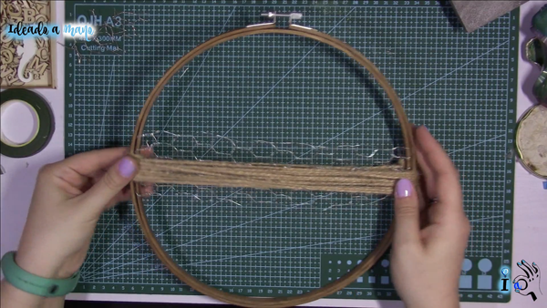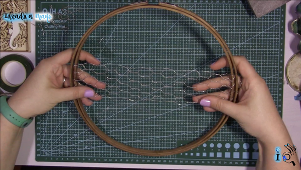 Comenzaré a explicaros cómo hice el de las amapolas. Lo primero que hice fue teñir los aros del bastidor con tinte para madera, y luego coloqué en el centro una tira de malla de gallinero, sujeta entre los dos aros.