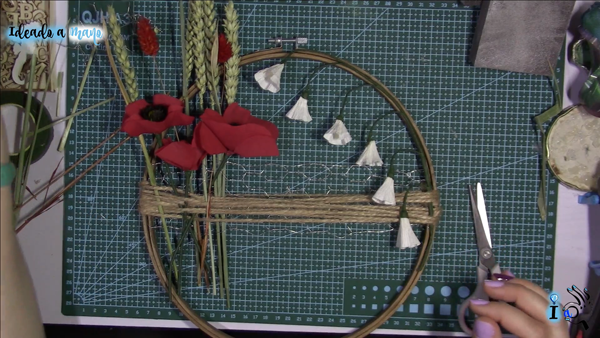 En estas cuerdas sujetamos las amapolas y campanillas que hicimos la semana pasada, junto con algunas espigas preservadas.