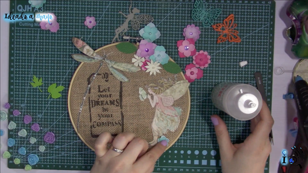 Y a continuación comenzamos a decorarlo, pegando recortes de papeles de scrap, flores troqueladas, flores pequeñas compradas, mariposas, hadas… lo que veais que puede quedar bien.