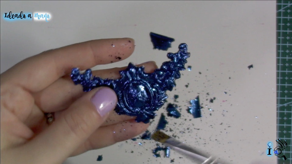 Y en la parte inferior coloco una figura de pasta DAS que he hecho con un molde. Le doy primero una capa de pintura plateada, luego mixtión y cuándo está mordente pongo pan de oro de color azul. Luego lo barnizo con gomalaca y le aplico una pátina de color bronce para resaltar el relieve.