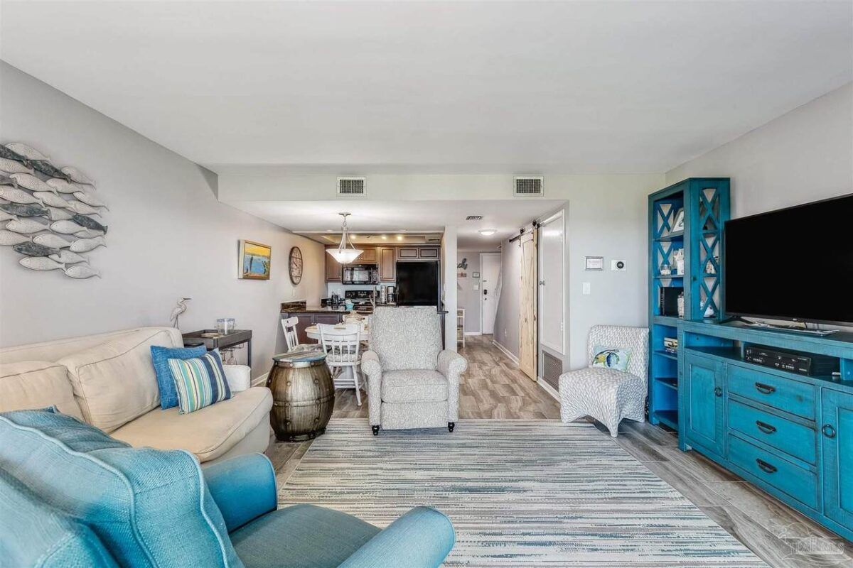 En el salón, el ambiente más neutro languidece un poco para dejar paso a una explosión de color azul en unos muebles de estilo náutico que aportan vitalidad y serenidad a la vez. Un toque divertido y original sin dejar de lado la sobriedad del mar, que se puede vislumbrar desde la puerta que nos lleva a la terraza (pero de eso hablaremos más tarde).