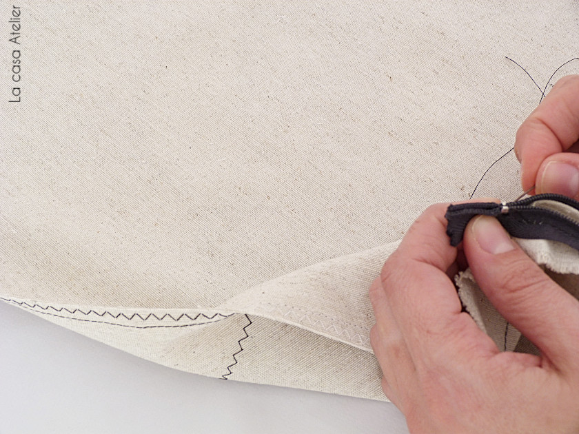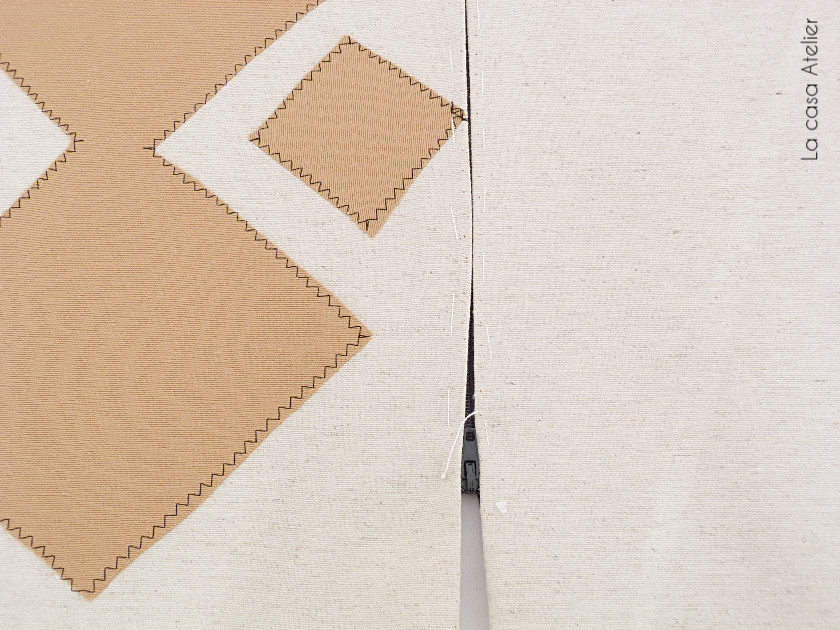 4. Doblamos un cuadrado sobre el otro dejando el derecho del cojín hacia dentro. Cosemos dos de los lados y antes de coser el tercero abrimos la cremallera. Rematamos el lado de la cremallera, quedarán unos centímetros sin coser al inicio y final de la cremallera: con puntada oculta y a mano unimos esos centímetros. En mi caso el cojín es de 45 cm y la cremallera de 40 cm. A cada lado quedan 2.5 cm.