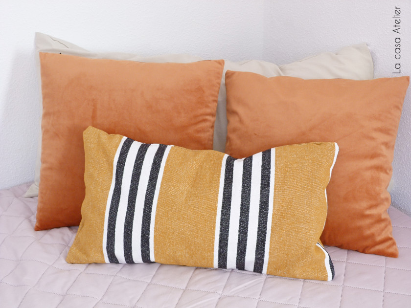 Los cojines rectangulares dan un toque especial a la composición y además son muy cómodos para apoyar la cabeza o las lumbares. He cosido este con una tela tipo saco en color mostaza con rayas blancas y negras. La tela es de Ribes y Casals y es perfecta para hacer cojines. Aquí el proceso ha sido mucho más sencillo porque no he creado ningún estampado.