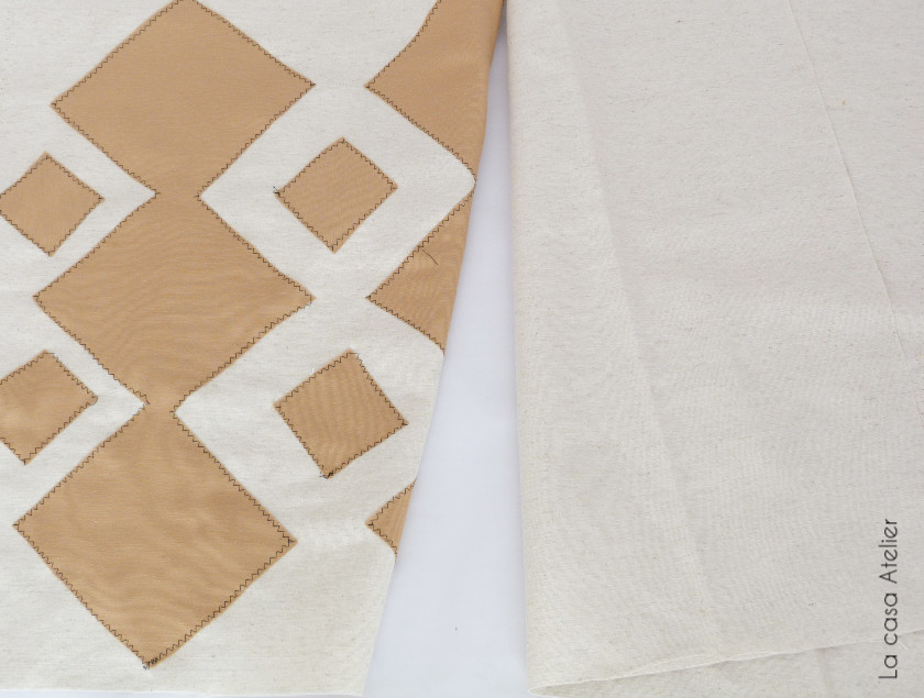 2. Para crear un cojín boho a partir de unas telas lisas, vamos a crear un estampado geométrico en unos de los cuadrados. Yo he combinado lonetas de varios tonos pero puedes usar retales para crear el dibujo geometrico.