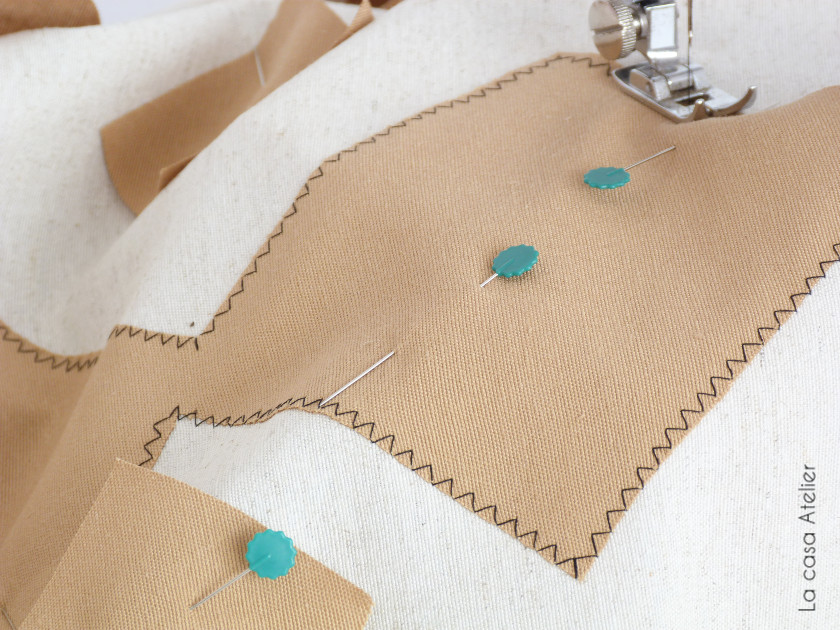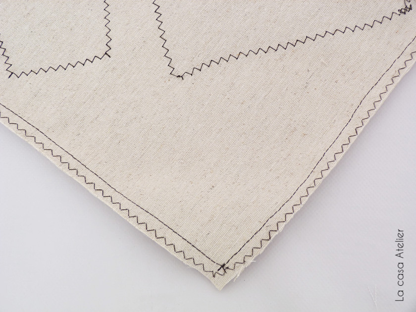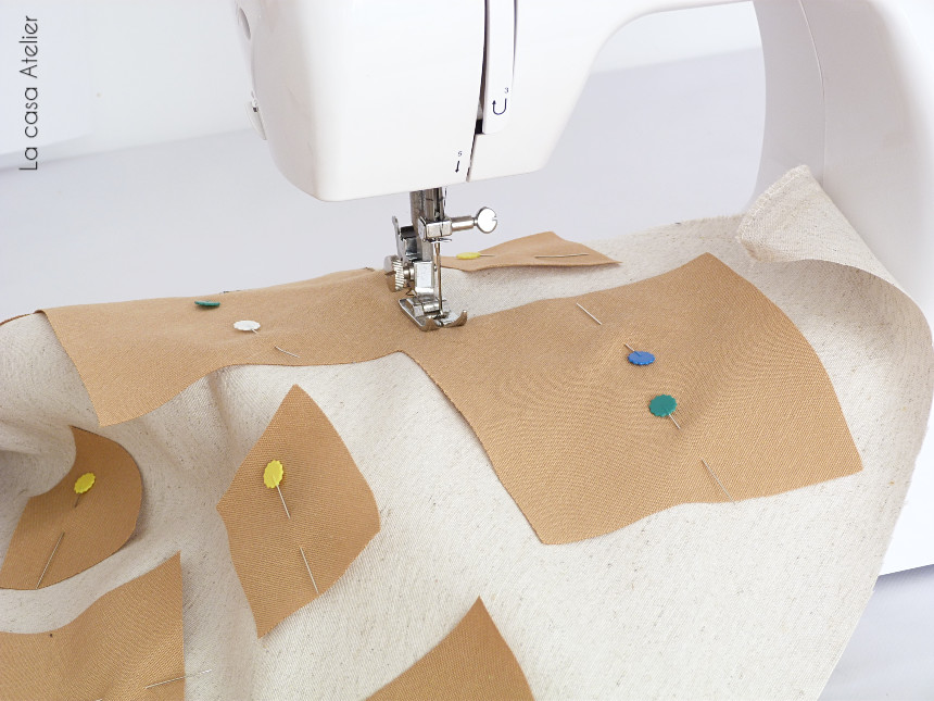 Sobre un cuadrado de loneta color natural creo un estampado geométrico cortando trozos de loneta marrón. Los sujeto con alfileres y coso sin dobladillo con puntada en zig zag con hilo de color negro para que la puntada sea parte del estampado.