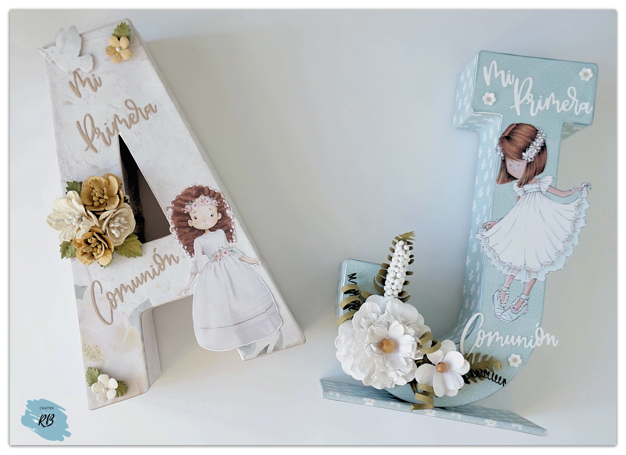 La letra A, está decorada con papeles de Papers for You, colección Un día de ilusión y la letra J, con el papel Sunflowers de Dayka Trade.