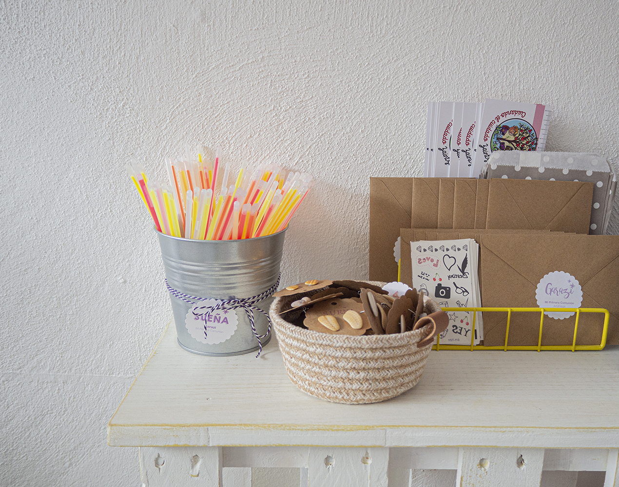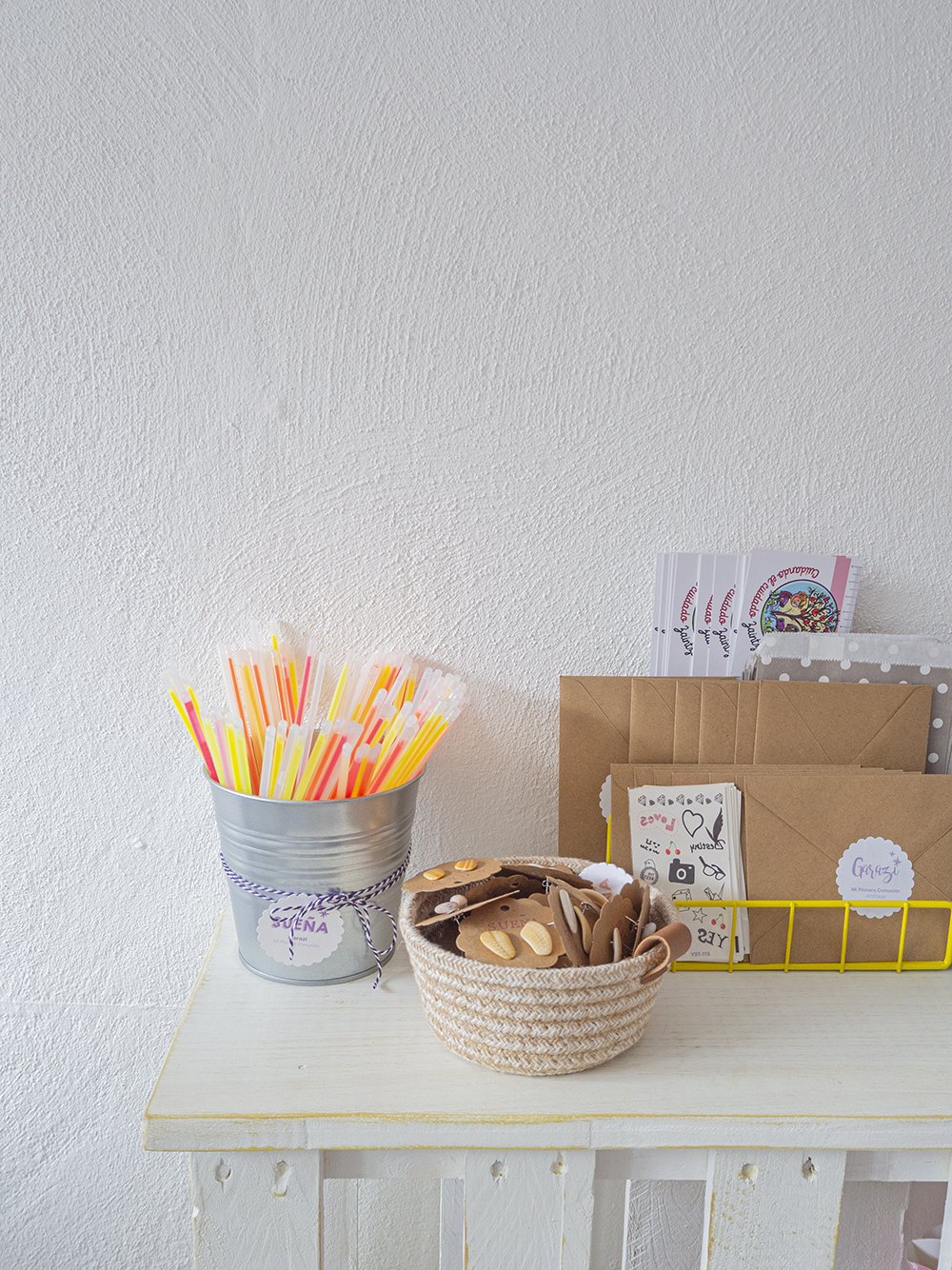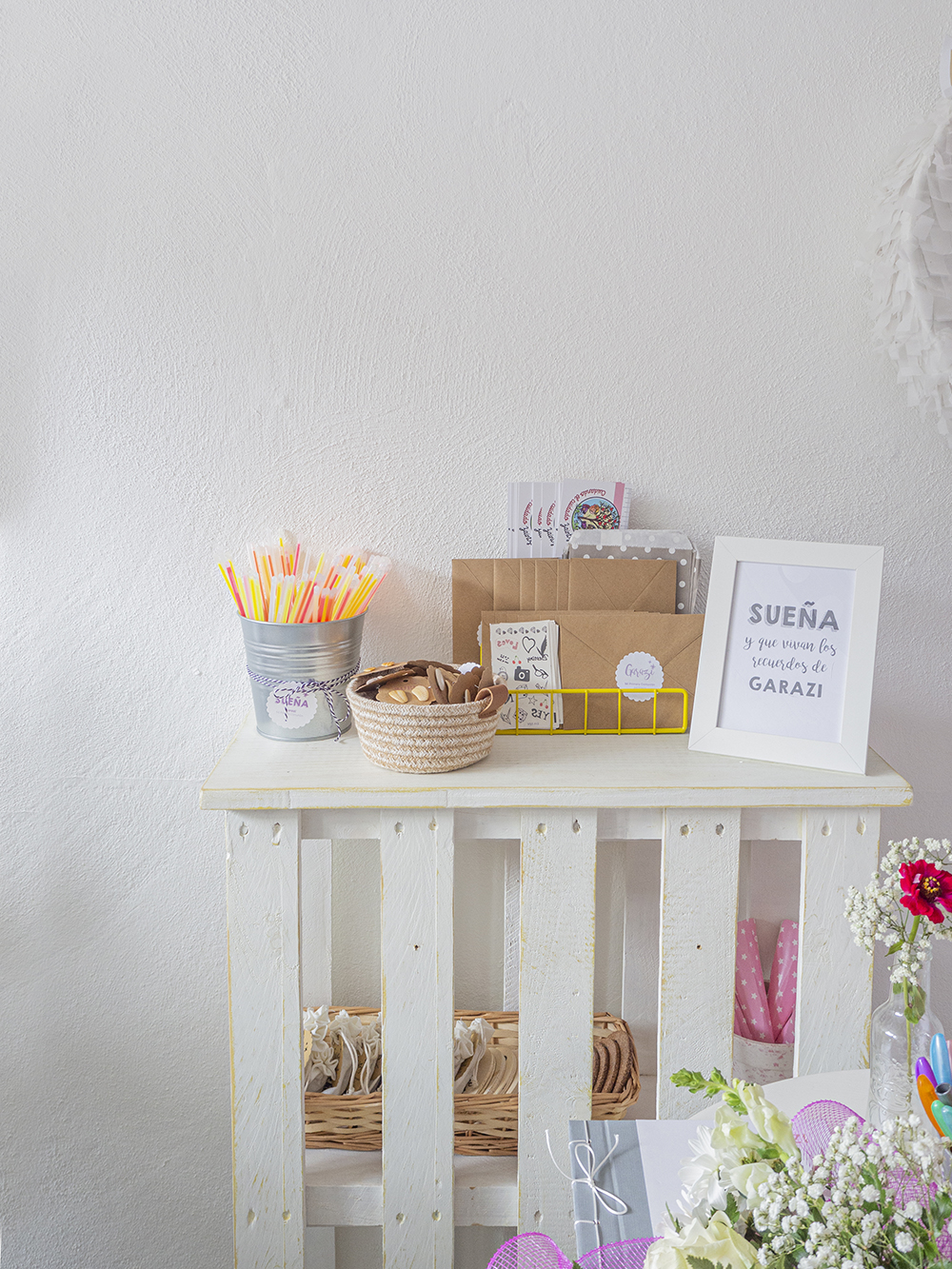 Al lado del candy bar, bien pegadito por el espacio limitado, creamos una zona para los recuerdos con una cámara Instax mini como esta que le regalaron, un libro de firmas para fotos y dedicatorias, pegatinas, tatuajes de calcomanía, fotos, citas decorativas, bolígrafos de colores, coronas unicornio, estas barras luminosas que triunfaron en la disco, y todos los regalitos que preparamos con mucho cariño