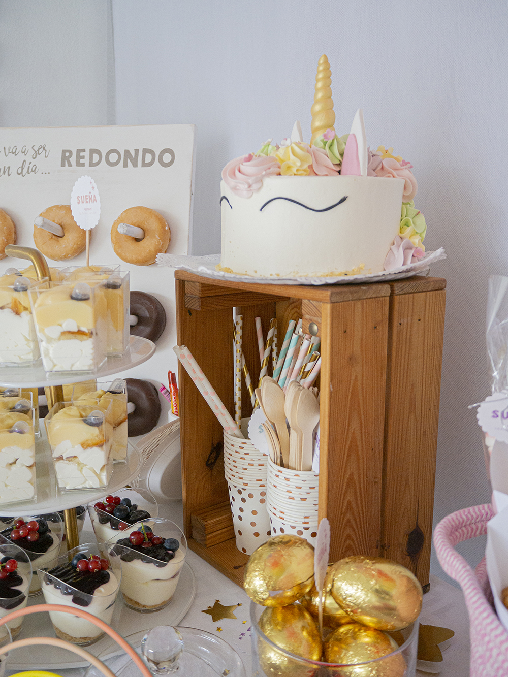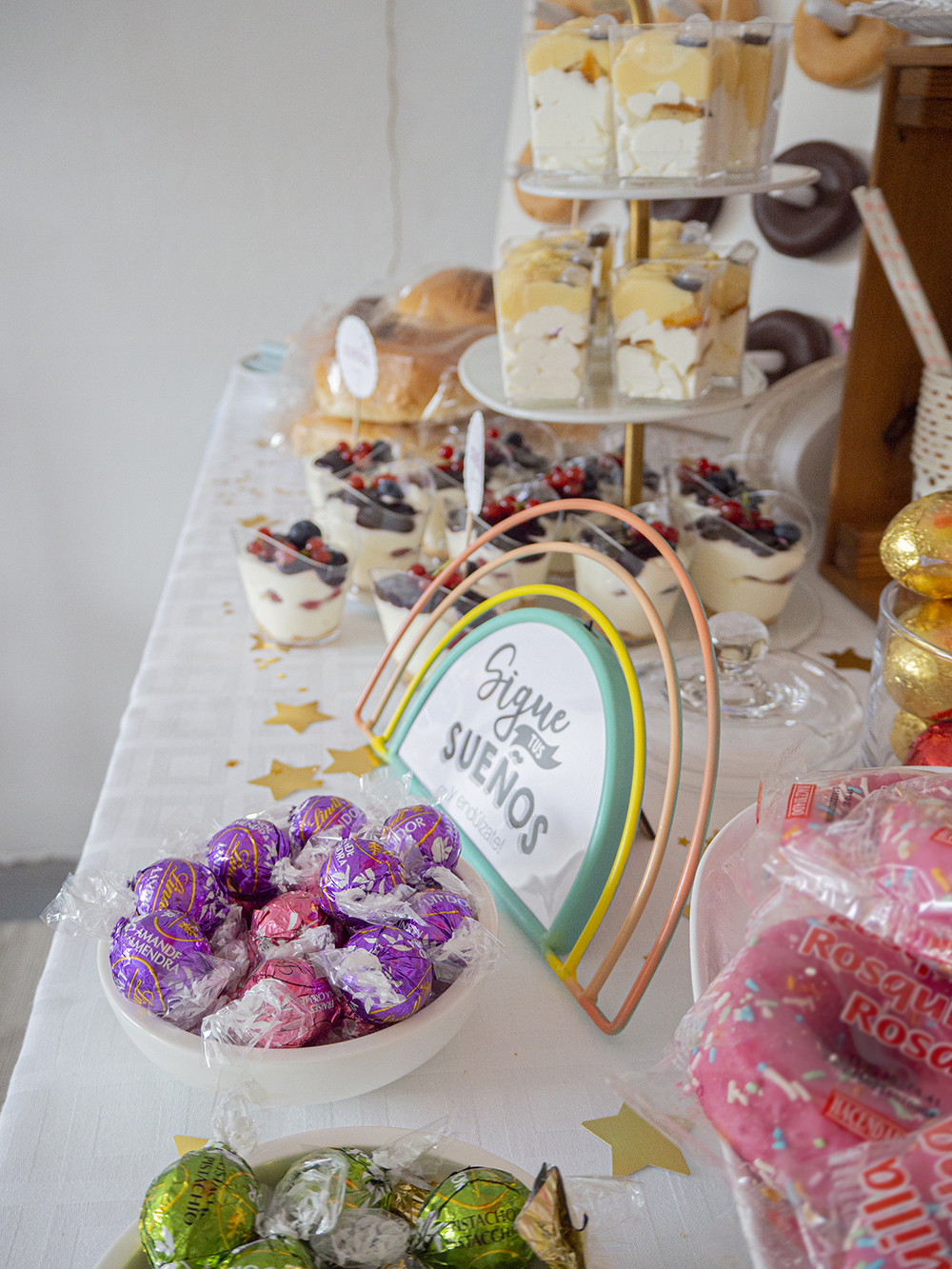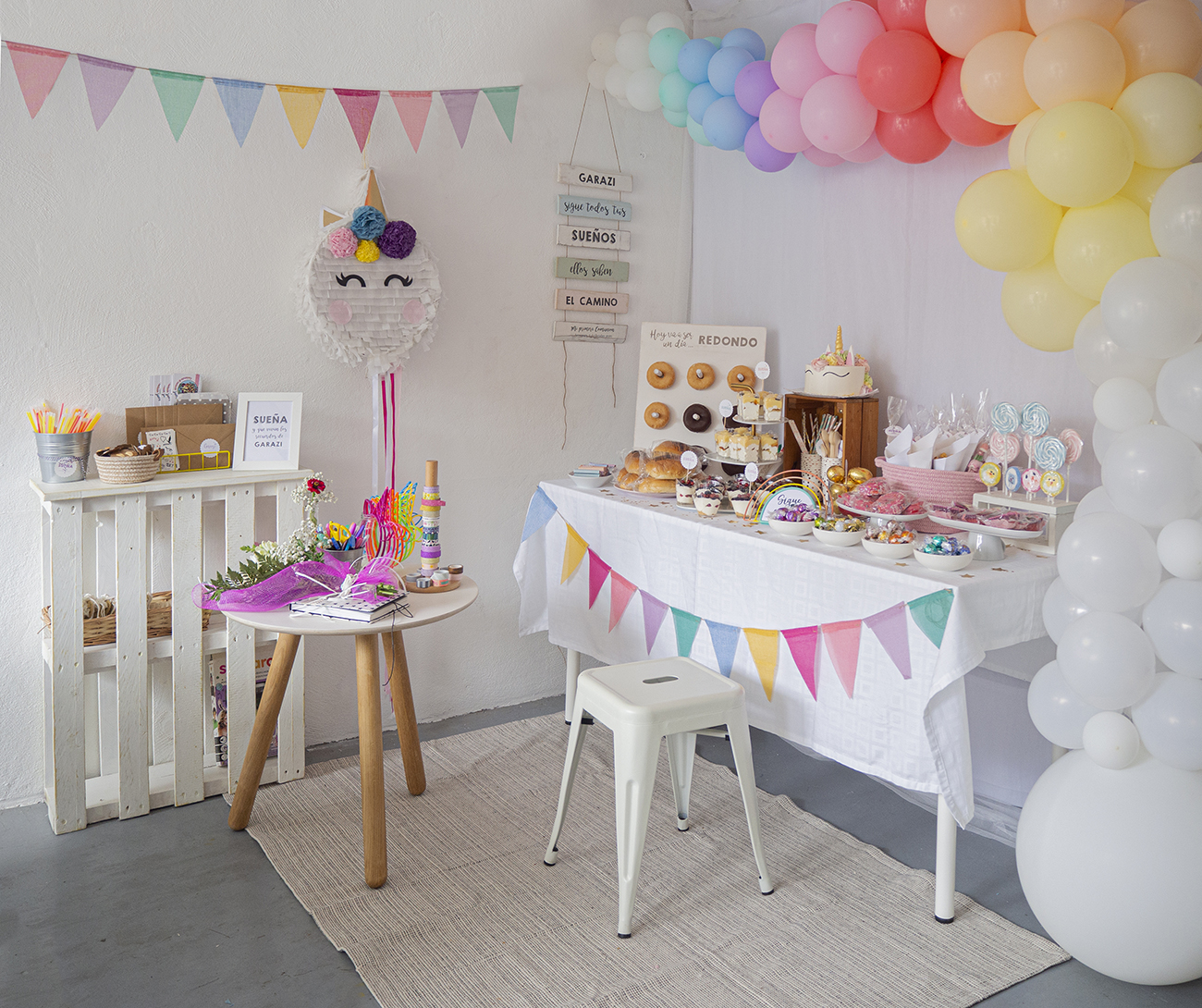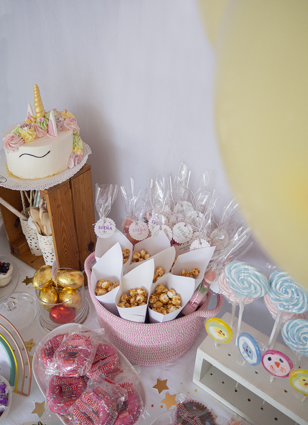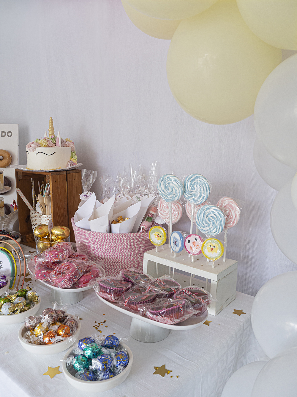 Para el candy bar elegimos la tarta unicornio y los dulces ricos de la pastelería Martina de Zuricalday y otros más «guarretes» que siempre gustan como palomitas en conos, brochetas de frutas y gominolas, piruletas, bombones y chololatinas, donuts, bollitos de mantequilla de Bilbao, piruletas… Todos personalizados con la frase y temática elegidas bajo un gran arco iris de globos ¡Una bomba azucarada nada saludable pero llena de muuucho amor, alegría y de color! Happy rainbow!