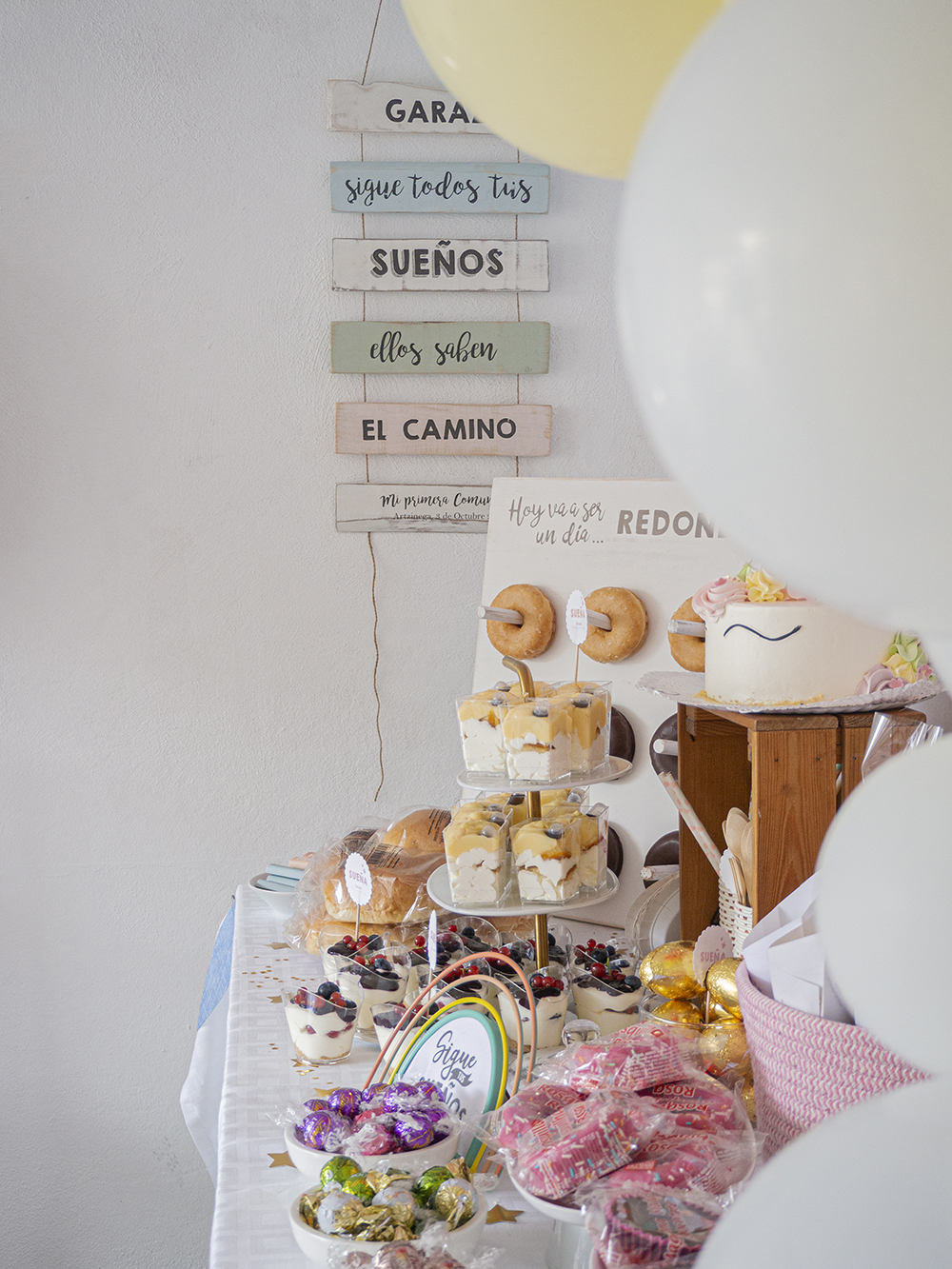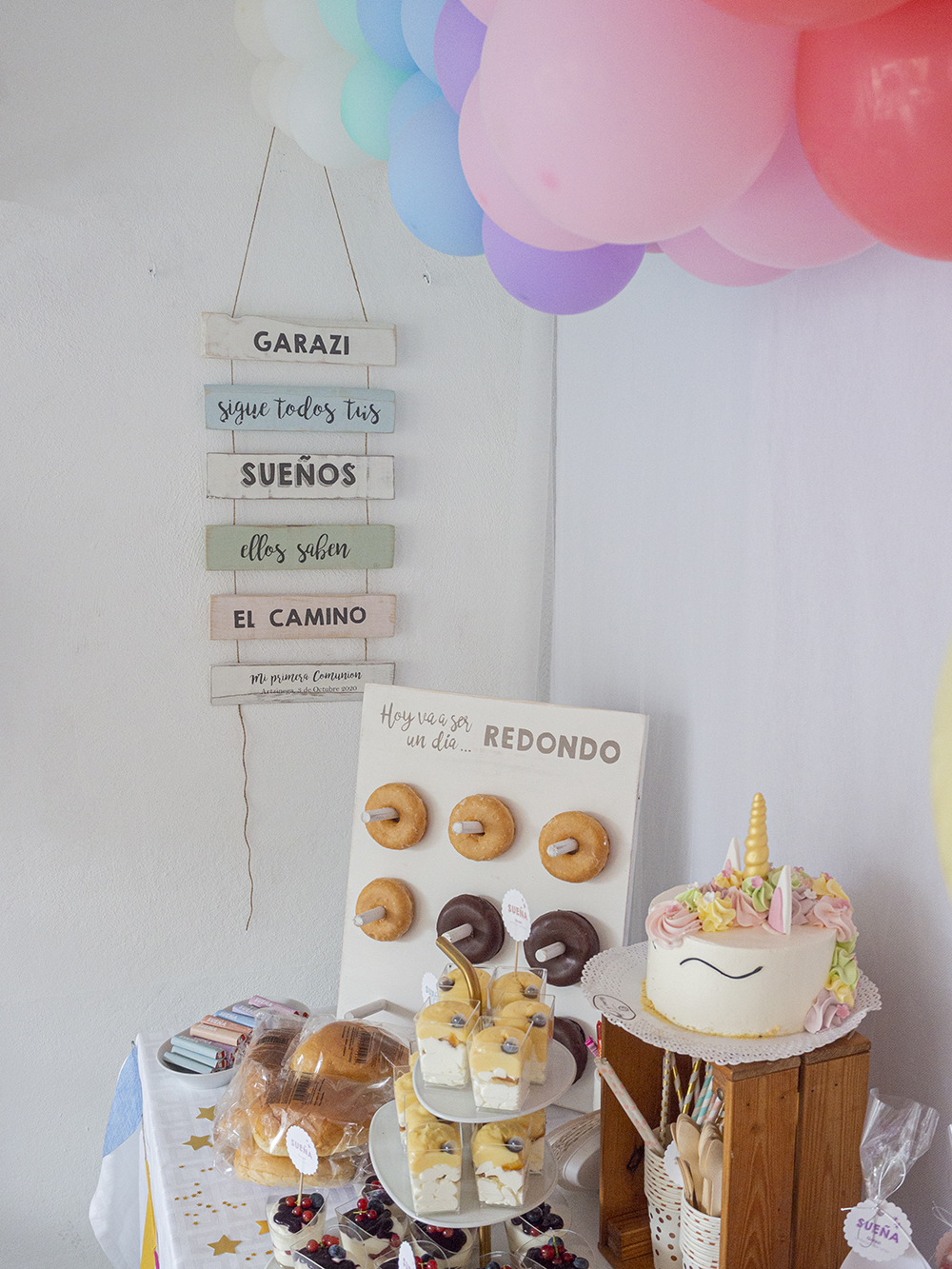 ¿Os acordáis de este cabecero que hicimos para el dormitorio de la exploradora? El texto nos gustó tanto a todos en casa, que decidimos usarlo como leitmotiv de la comunión. Con esta frase «Sigue tus sueños, ellos saben el camino» diseñamos todo y visualmente lo acompañamos de arco iris, estrellas, nubes, colores y algún que otro unicornio ¡Un universo de color y fantasía que entonces era muy propio de la exploradora! Ahora, después de 3 años, seguro que hubiera elegido otra temática ¡se hacen mayores! jajaja!