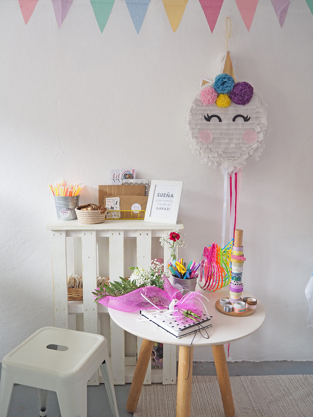 Un tipi indio blanco (que algún día nos llevaremos al monte o a la playa para hacer un picnic), una piñata unicornio que hicimos con cartón y papel de seda, pendientes con conchas y piedras de las salvajes playas de Las Landas, unas bolsas de tela y unas tablas de madera con la frase que nos inspiraba, un libro de firmas handmade, el porta donuts y porta piruletas de madera del candy bar, la madera de bienvenida a la comunión, brochetas de chuches, posa-vasos de madera y corcho con la técnica transfer, la diadema de flores preservadas que llevó (¿Os acordáis de que hicimos varias y las sorteamos aquí?) o llaveros estrella de cerámica que hicimos en el taller de cerámica Cocomotora y que nos ayudó a acabar la tía Laura ¡Gracias bella!