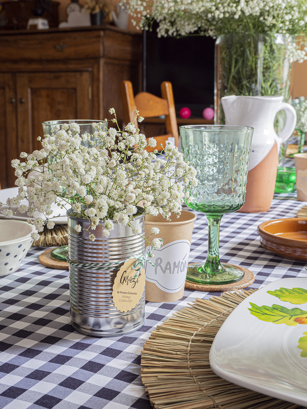 Esto nos animó y dio el impulso suficiente para ordenar el garaje, pintarlo de blanco, o tapar las partes más feas con cortinas. Con este espacio más neutro, instalamos la zona de candy bar, un pequeño espacio de recuerdos y dos mesas en tonos blancos y rosados usando los manteles individuales que usamos en su cumpleaños y que podéis ver aquí. Para el resto de invitados, usamos el txoko, que como aún tenía su estética rústica en tonos verdes, vestimos con un precioso mantel de cuadros blancos y negros que nos cosió amama, acompañado por servilletas de tela dobladas en forma de cesta, vasos personalizados, paniculata por todas partes y otros detalles campestres bonitos.