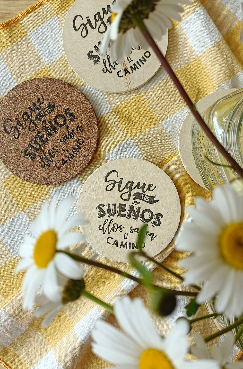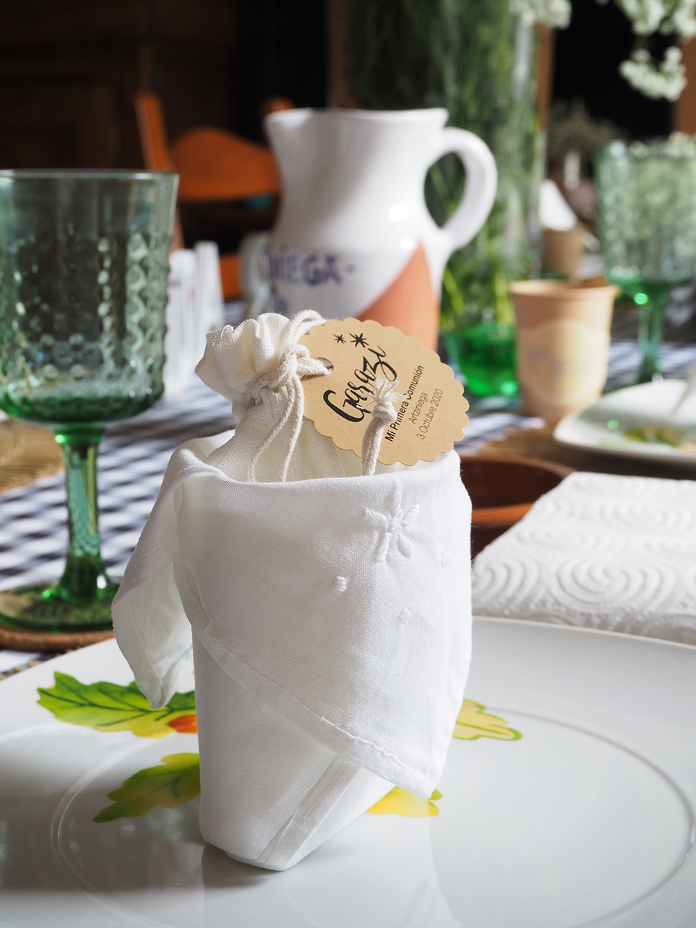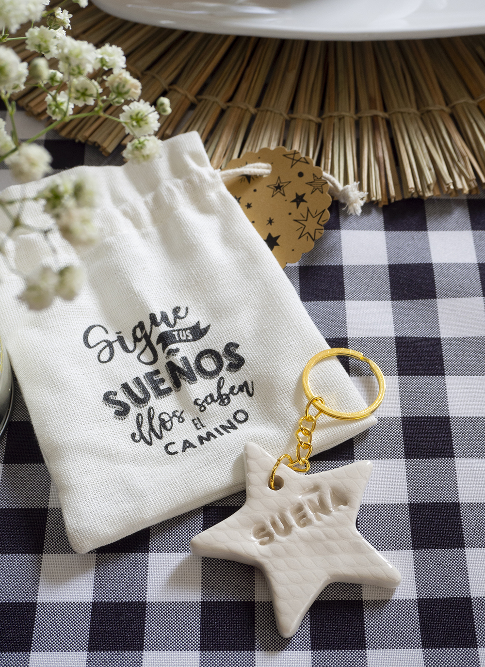 La idea era hacer estrellas de cerámica con la palabra «Sueña» y usarlas a modo de servilletero personalizado con un lazo y unas flores para cada persona invitada, pero finalmente los convertimos en un llavero para regalar a la familia y amigos. Ese llavero bien guardadito en una pequeña bolsa con la misma frase, fue el regalito de recuerdo principal de la comunión ¡Pero hubo más! Si os interesa, seguid leyendo 😉