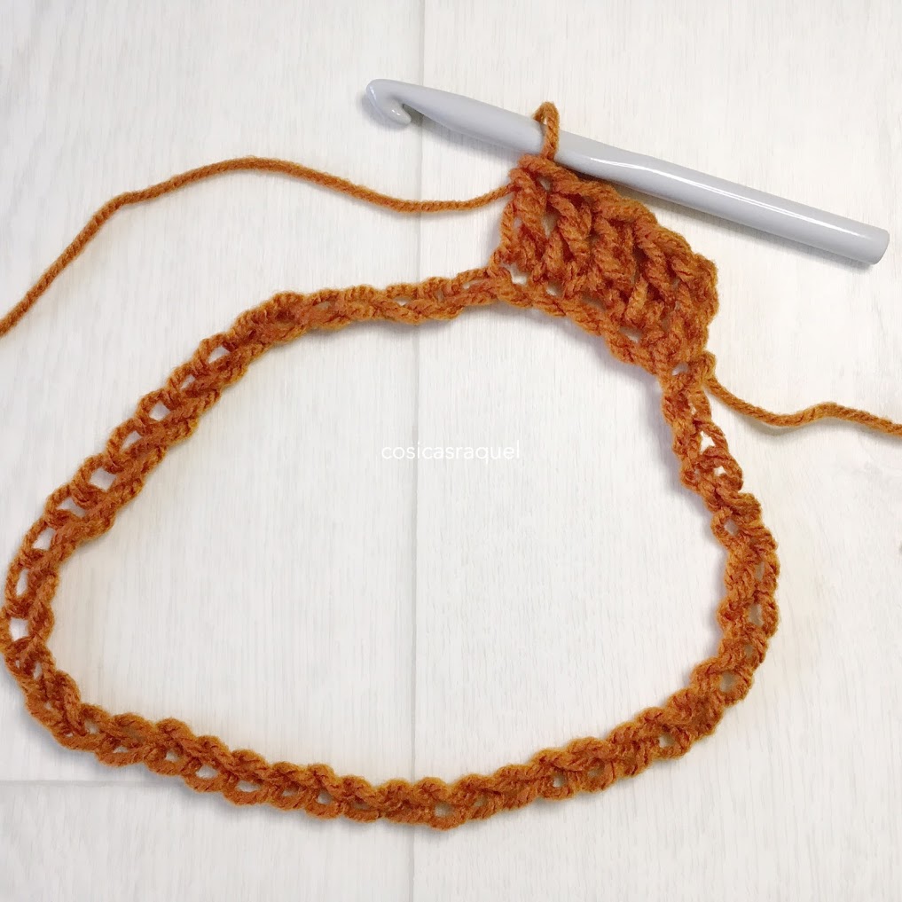 5.- *3cad, 1pa en cada punto (100pa), une con pr a la tercera cad* , continua así * tejiendo vueltas dobles hasta la largura que te guste.