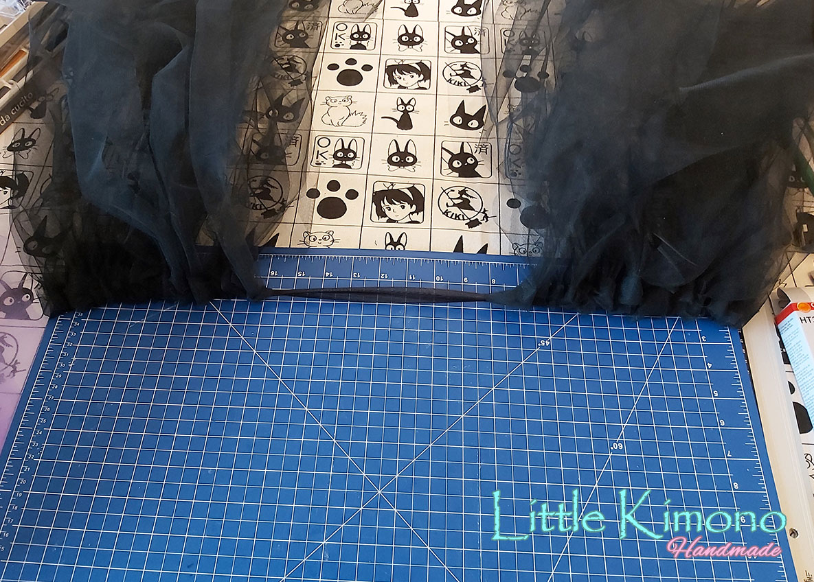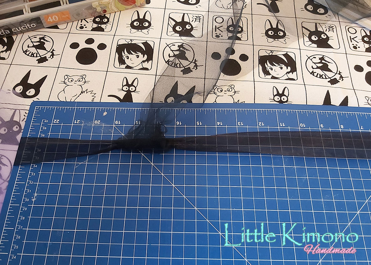 5. Primero las negras, la mitad a un lado y la otra mitad al otro lado. Luego repetimos el mismo proceso con el tul morado y las atamos en el centro.