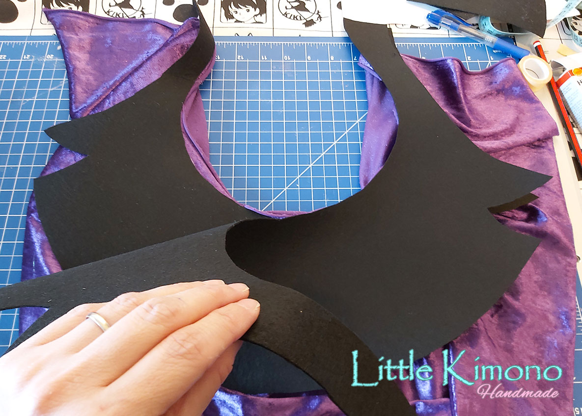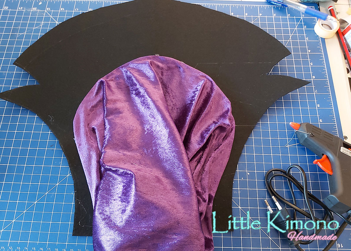 3. Luego pegamos la otra pieza de fieltro encima de la anterior, esto es para que tenga doble cuello, uno lo levantaremos y el otro cubrirá la capa, podéis ver el efecto final en las fotos de abajo 😉
