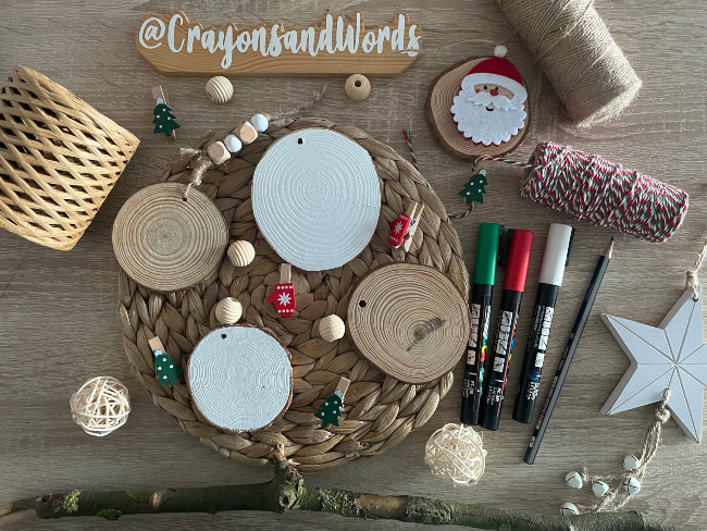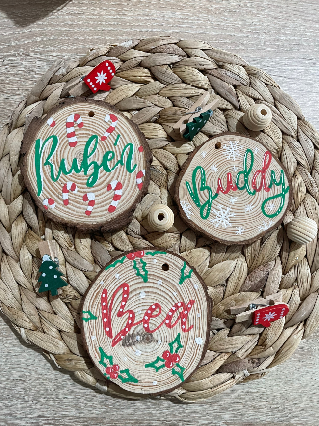 En primer lugar, escribimos los nombres, palabras, dibujos o frases en las rodajitas. Yo tenía ya dos pintadas con pintura blanca y quedan muy bien.