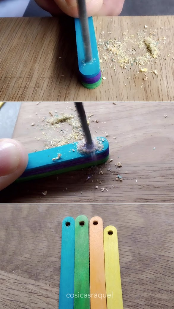 Preparamos los palos de madera haciéndoles un agujero con un taladro.