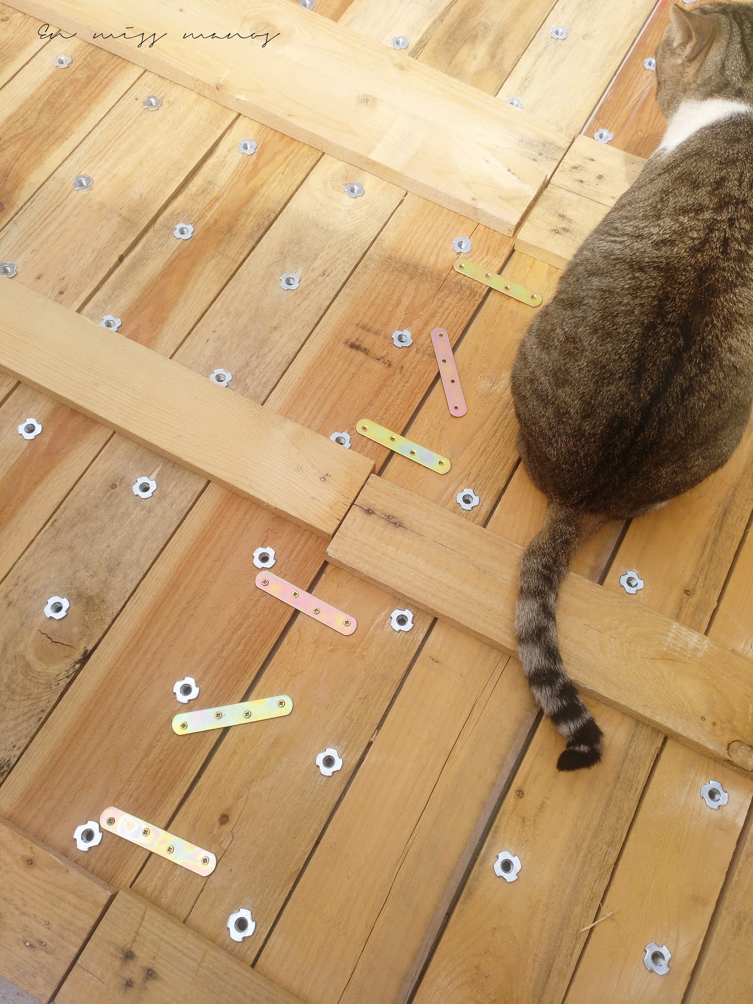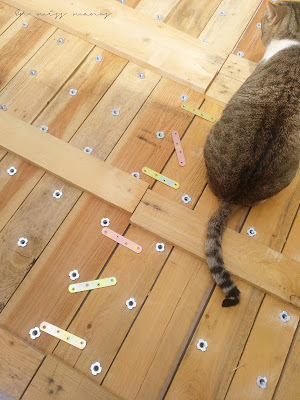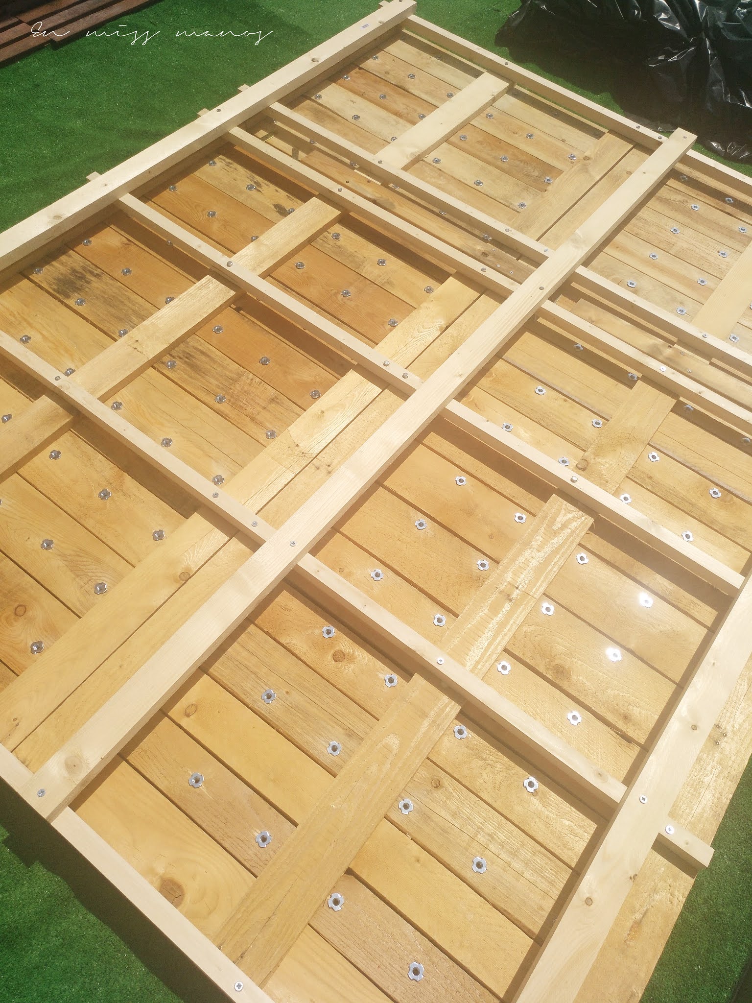 Ya con todas las tuercas puestas, uní las cuatro partes de palés para unificar toda la estructura.