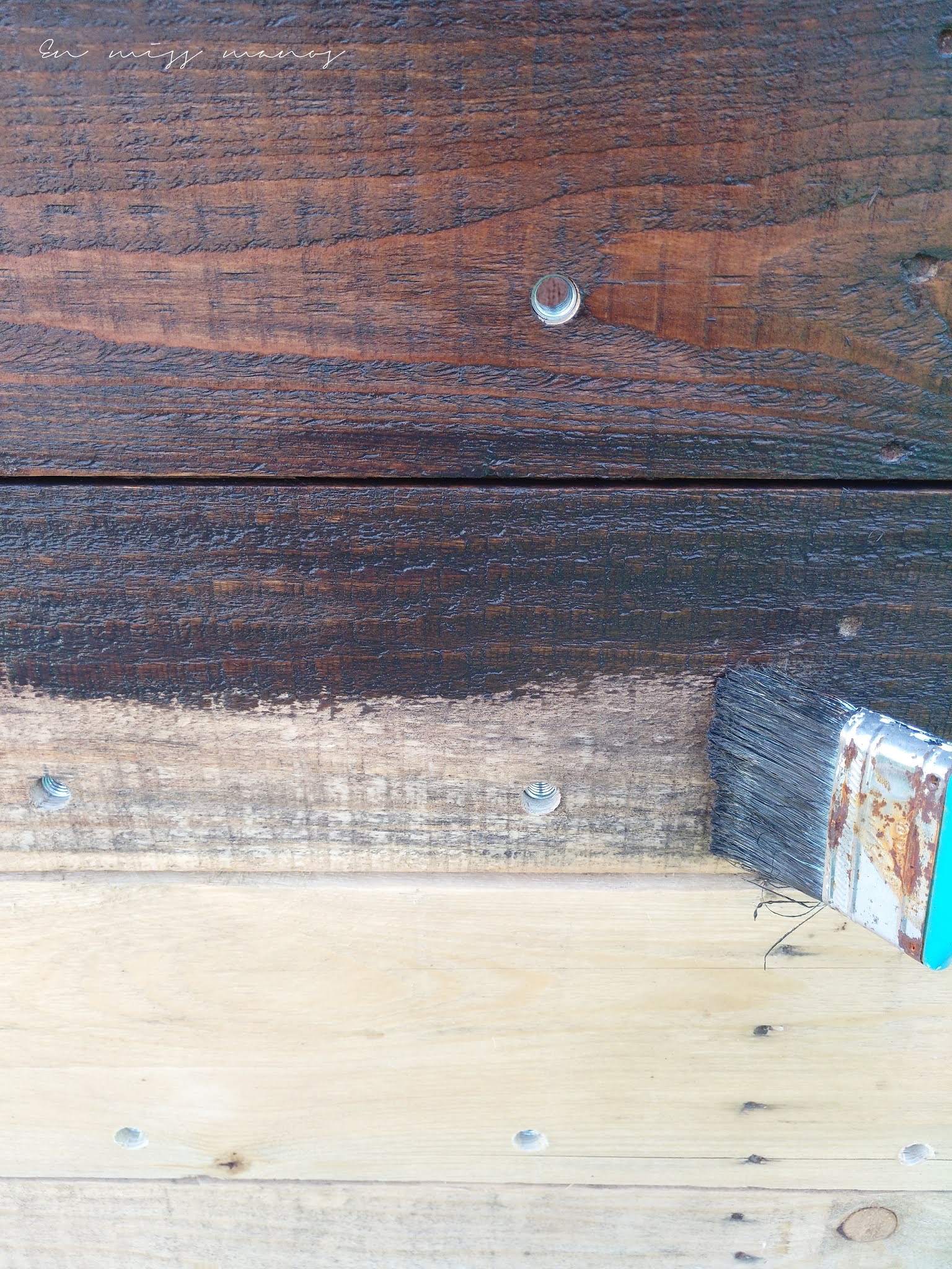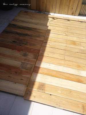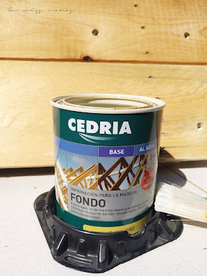 Como los palés eran un poco variados en tonos, tenían manchas, etc,…decidí darle color para disimular, y además dejarlo a juego con todo el mobiliario que tengo en la terraza.