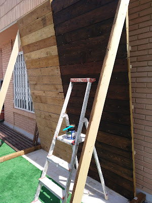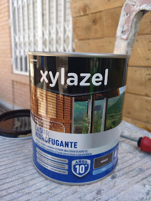 Utilicé un lasur oscuro, para proteger toda la madera contra la lluvia y sol, ya que esta terraza, de sol está bastante servida. De lluvia en Alicante no tanto…aunque justo en esta época no puedo decir nada sobre eso porque también estamos servidos!