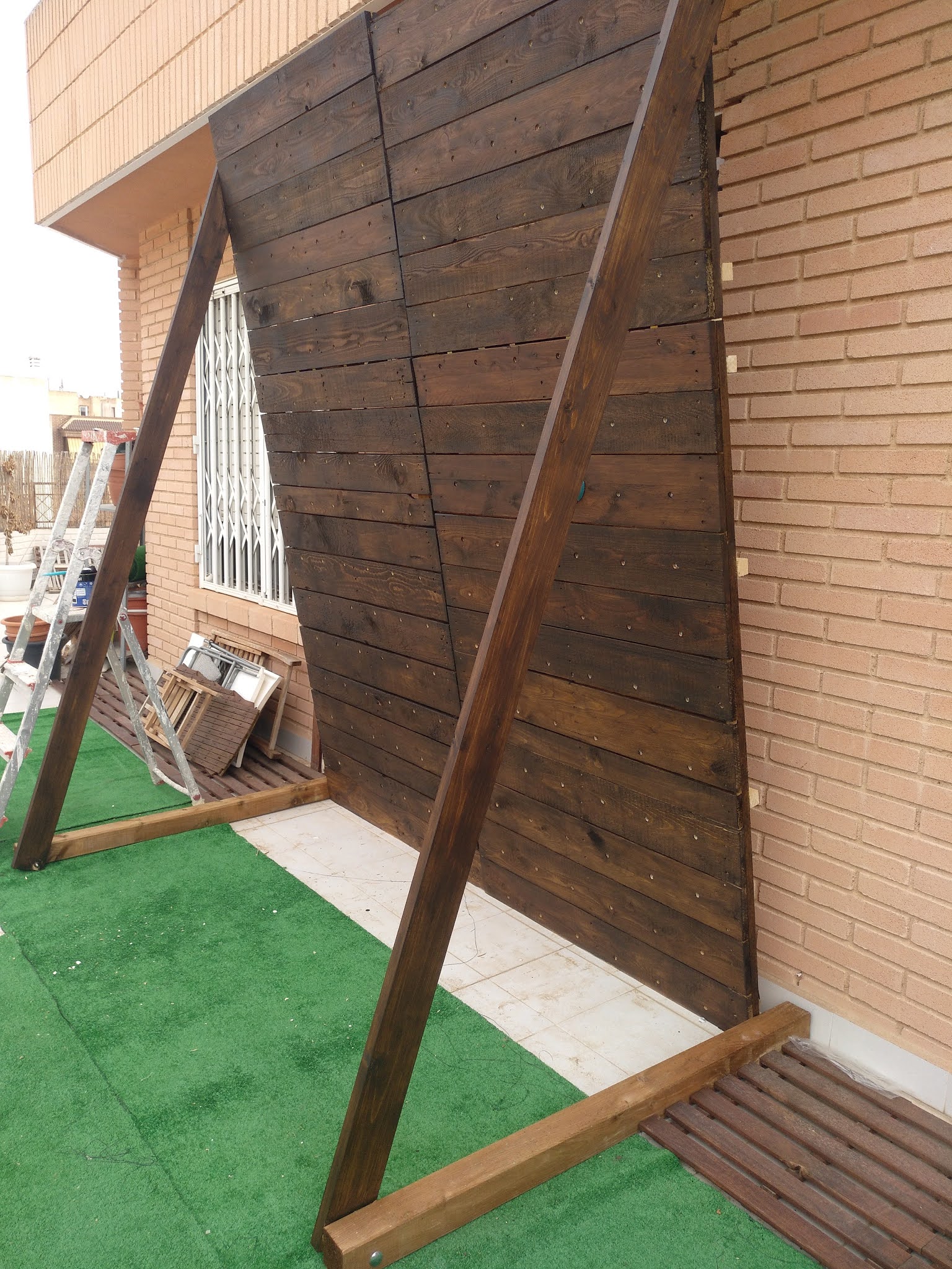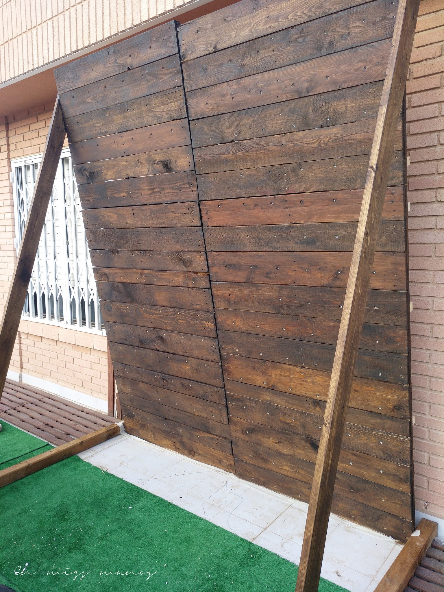 Los palés medían 100x160cm. Utilicé dos enteros y otro cortado por la mitad, por lo que uniendo todo se me quedaba una estructura de 2m de ancho x 2,40m de alto.