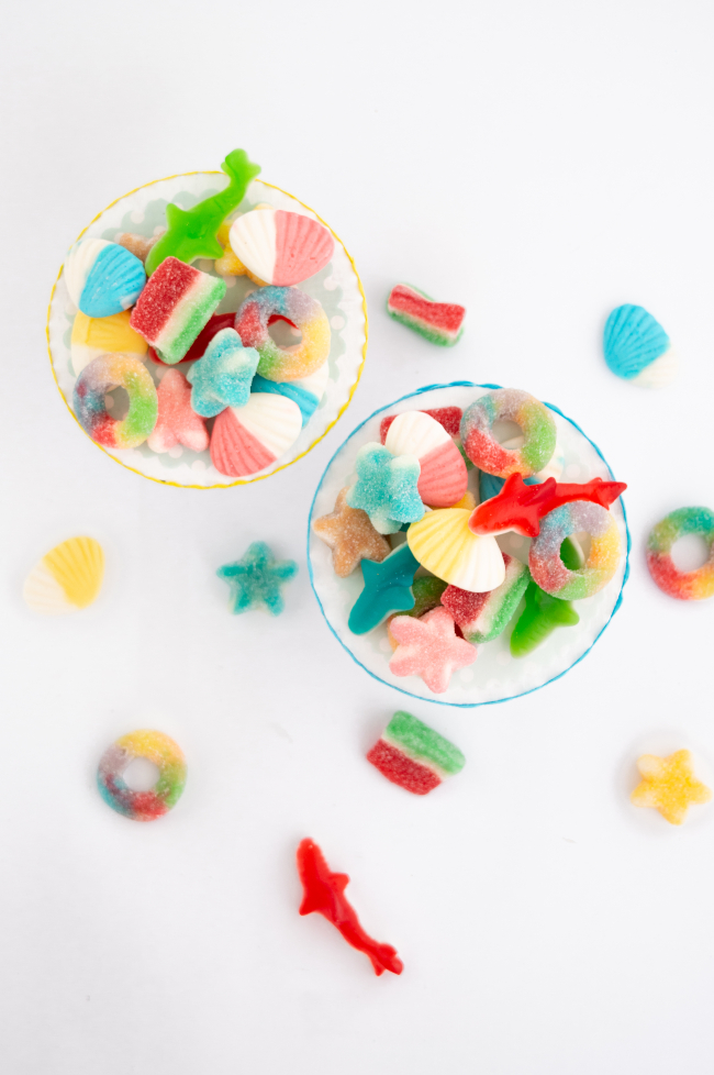En mi caso yo he elegido conchas de foam, gajos de naranja y de limón con picapica, tajadas de sandia con picapica, estrellas twist con azúcar, tiburones y aros multicolor azúcar. Todas ellas de dulceplus.