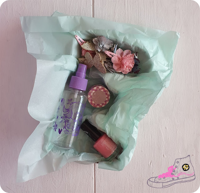 Y por último el regalo que va dentro, lo he ideado para regalar en plan caja de cuidate por fuera, con colonia, pinta uñas, balsamo labial y prendedores para el pelo… Envuelto en papel de seda…