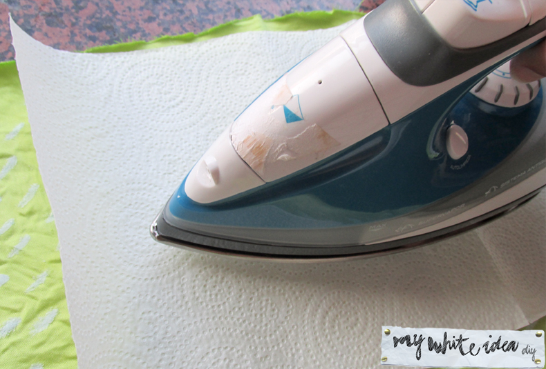 Con la tela seca, pondremos un trozo de papel de cocina o un periódico y pasaremos la plancha (tiene que estar sin agua) de este modo la cera se derretirá y pasará de la tela al papel.