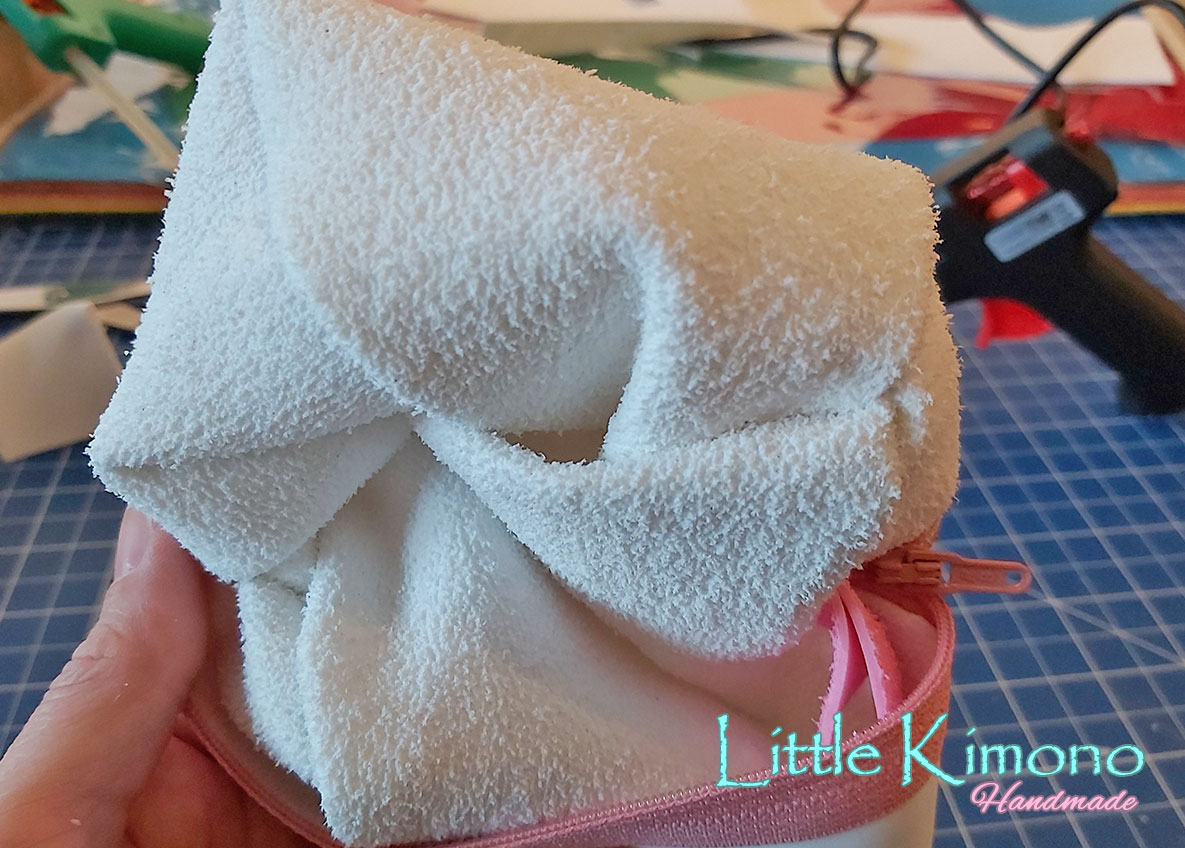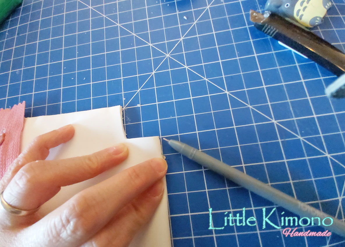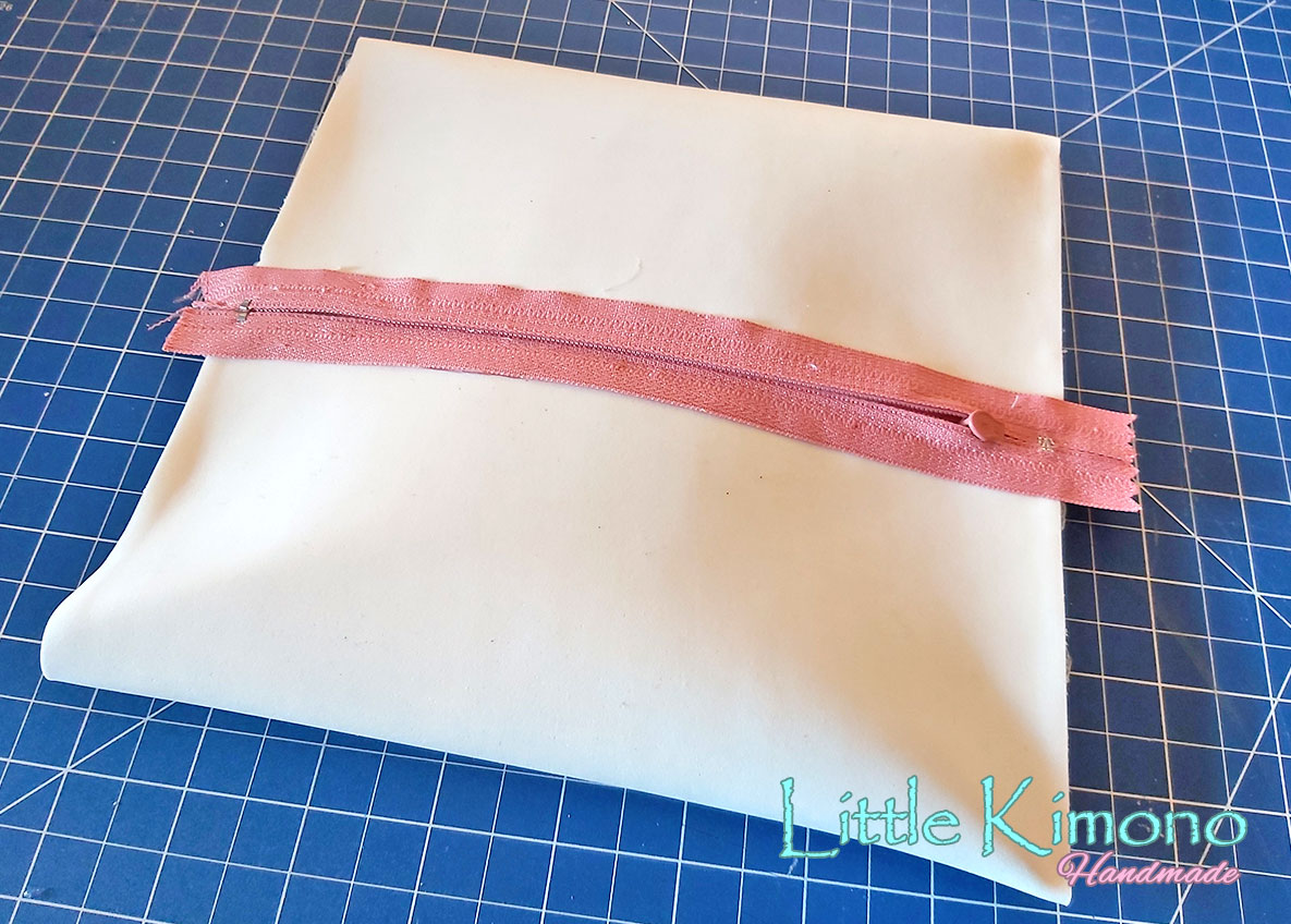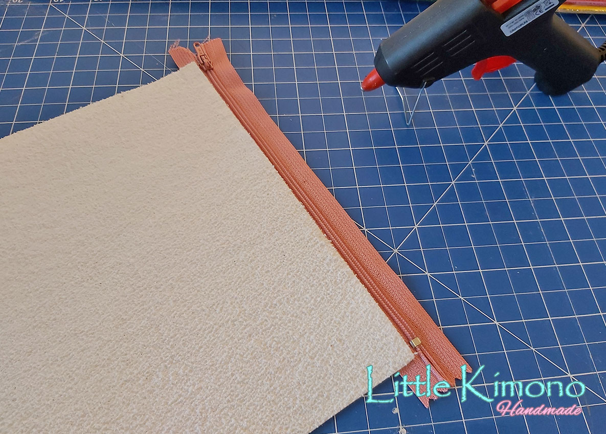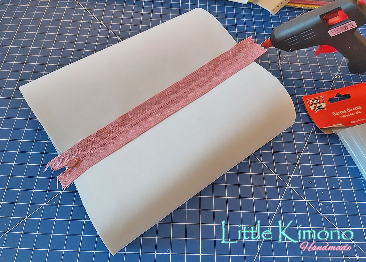 4. Hecho esto, vamos a centraremos bien la cremallera, si tenemos una tabla de corte podemos ayudarnos con la cuadrícula y luego pegaremos los bordes del estuche con la silicona caliente.