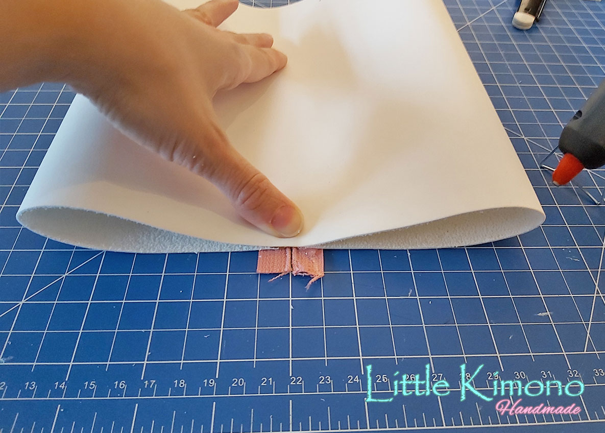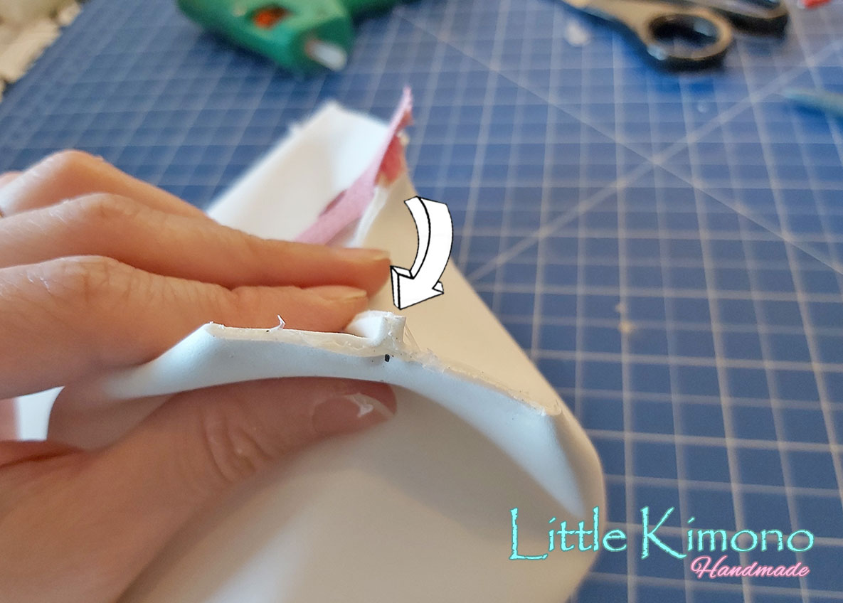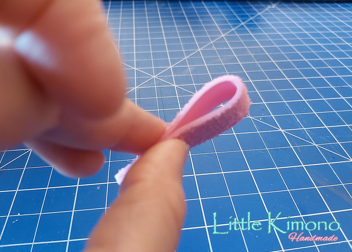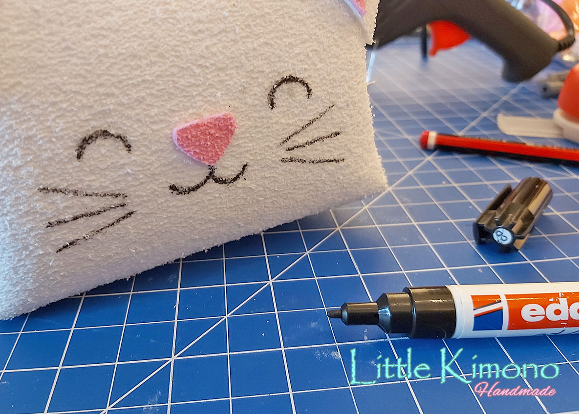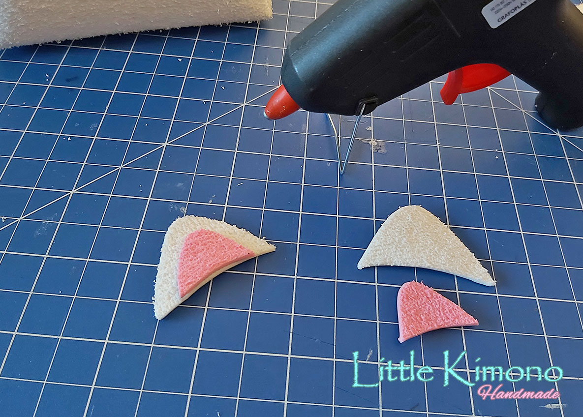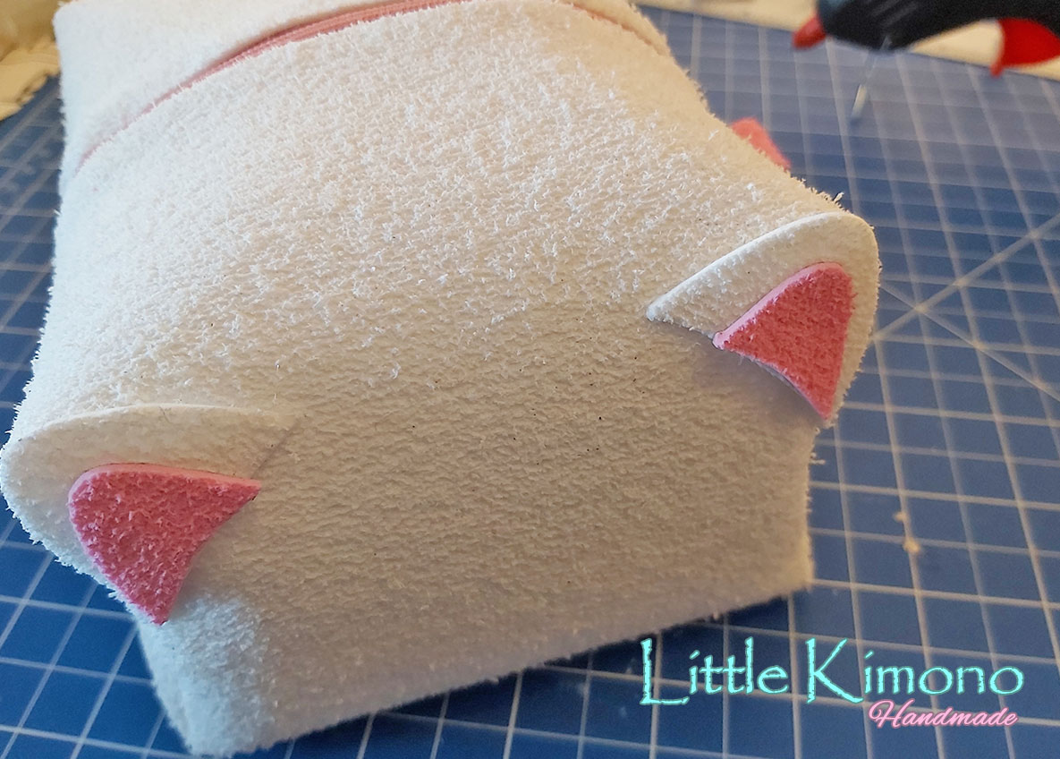 8. Cortamos las orejitas en blanco y rosa y las pegamos a unos de los laterales.