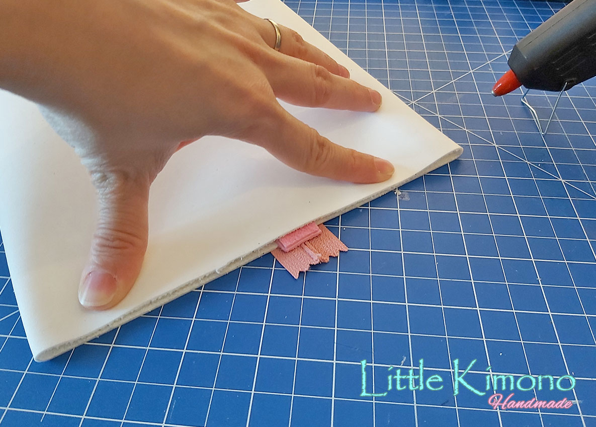 Pegamos con la silicona caliente tal como muestra la foto, uniendo la marca que hemos hecho con el borde que teníamos ya pegado de antes. Este paso es el que le dará la forma cuadrada al estuche.