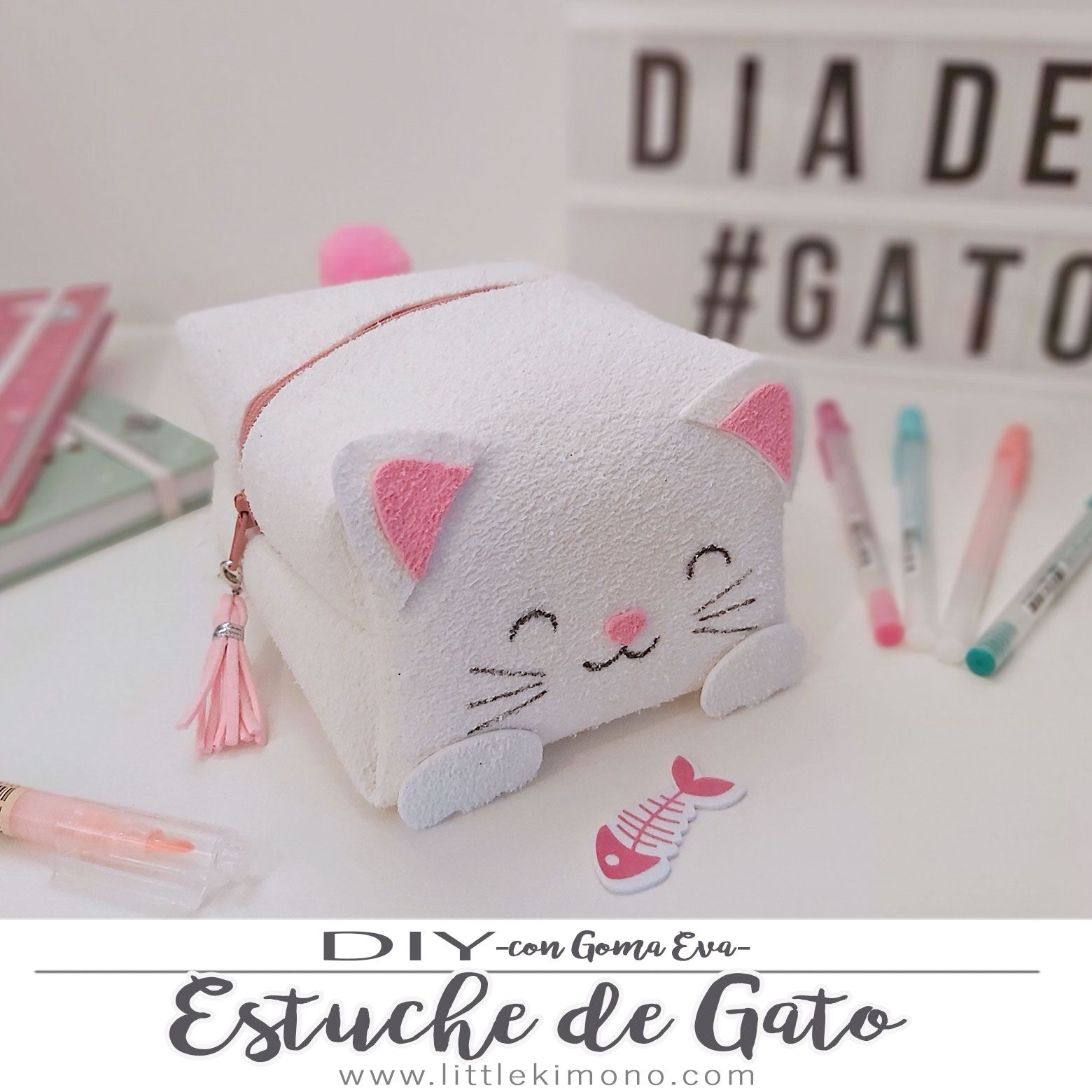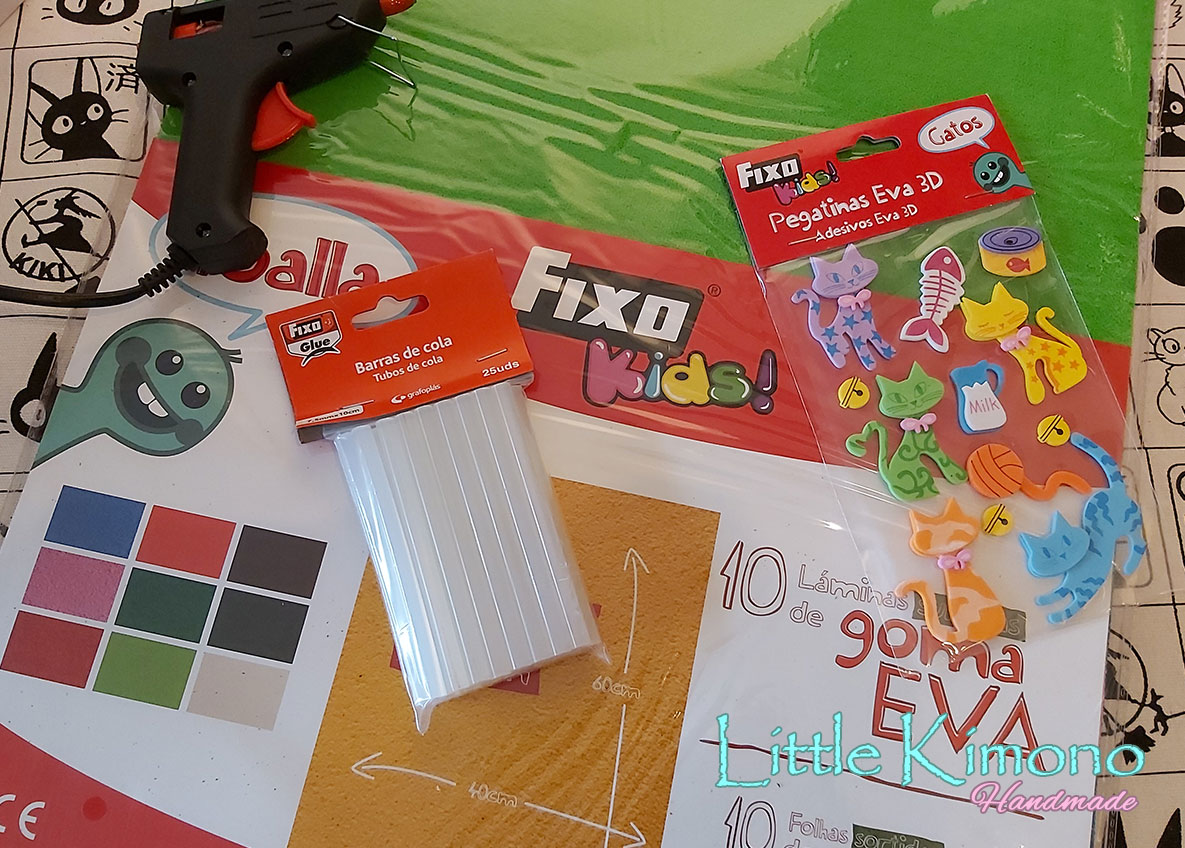 Así que vamos a hacer un estuche con forma de gatito fácil, fácil^^ pero esta vez no haremos el típico estuche plano sino que haremos uno de forma cuadrada usando la pistola de cola caliente, si no os habéis atrevido antes a hacer un estuche de este estilo por «miedo» a la máquina de coser^^ ésta es una manera fácil de hacerlo, como os he dicho éste lo vamos a hacer con goma eva pero con tela creo que también quedaría bien 😉