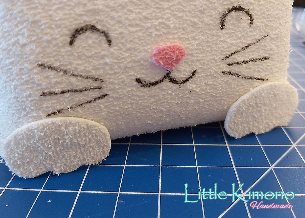 10. Unas patitas hechas con la goma EVA blanca y la colita, para la que usé un pompom rosa… aunque creo que parece más una cola de conejito^^ jiji