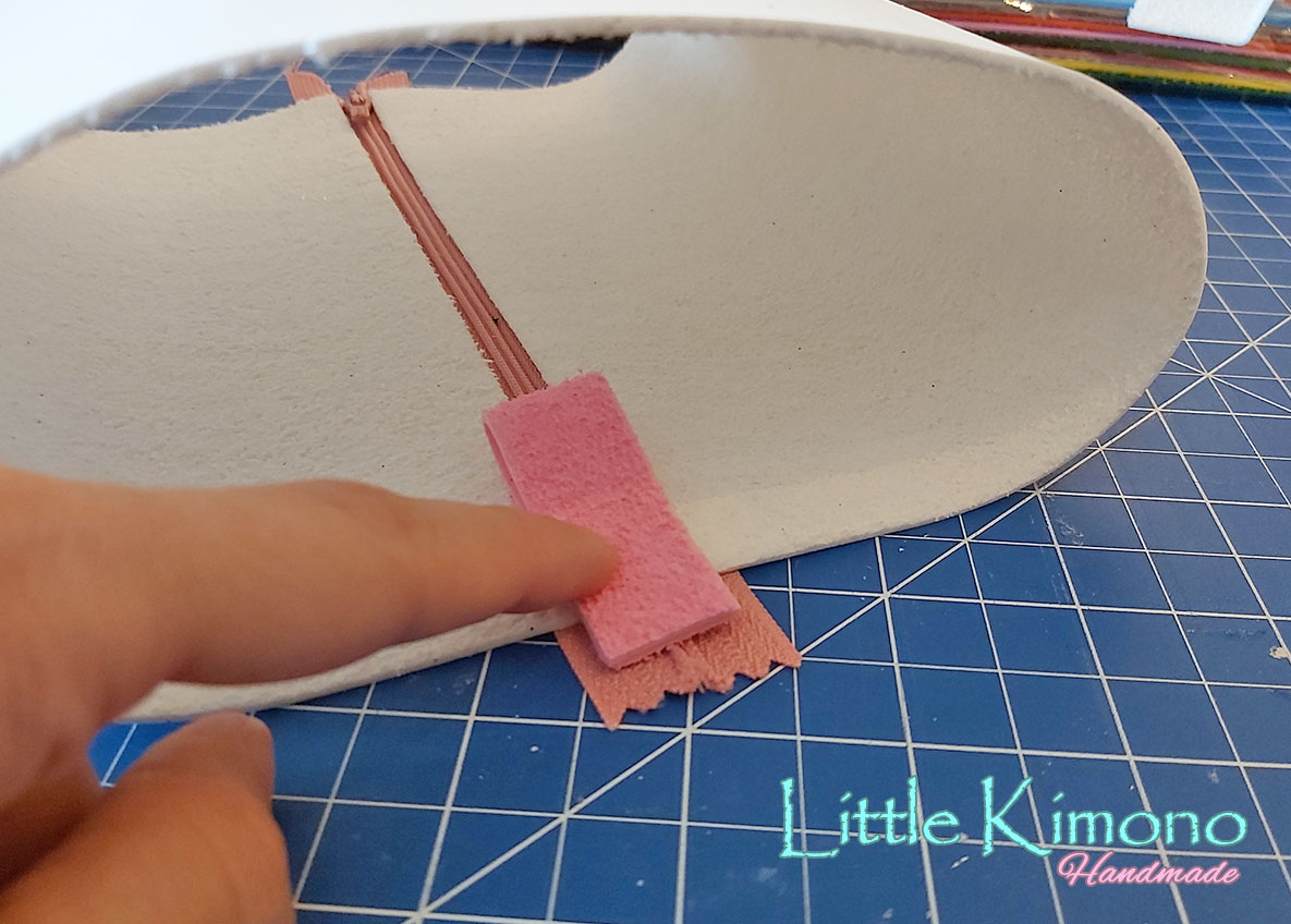 2. Ahora vamos a pegar a cada extremo del rectángulo la cremallera con la pistola de cola caliente, lo haremos del revés como si de un trabajo en costura se tratara, (la parte del pelito de la goma EVA quedará por encima de la cremallera como muestra la foto)