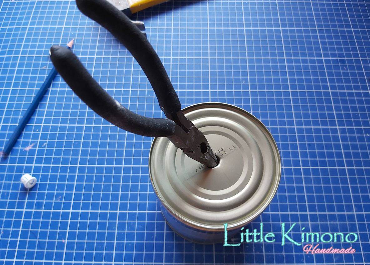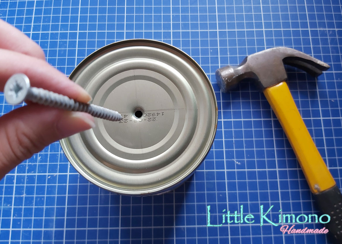 7. Ahora vamos a trabajar la lata, en mi caso el casquillo que tenía era reciclado de otra lámpara que se me rompió, así que con ayuda de un tirafondo y un martillo hice un agujero en el centro de la lata y con unos alicates girando suavemente fui abriendo el agujero hasta el tamaño deseado para pasar el cable y poder enroscar la tuerca al otro lado.