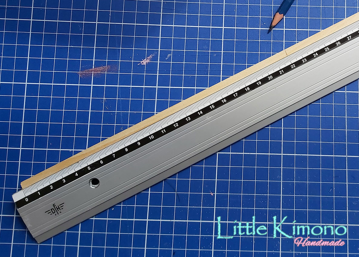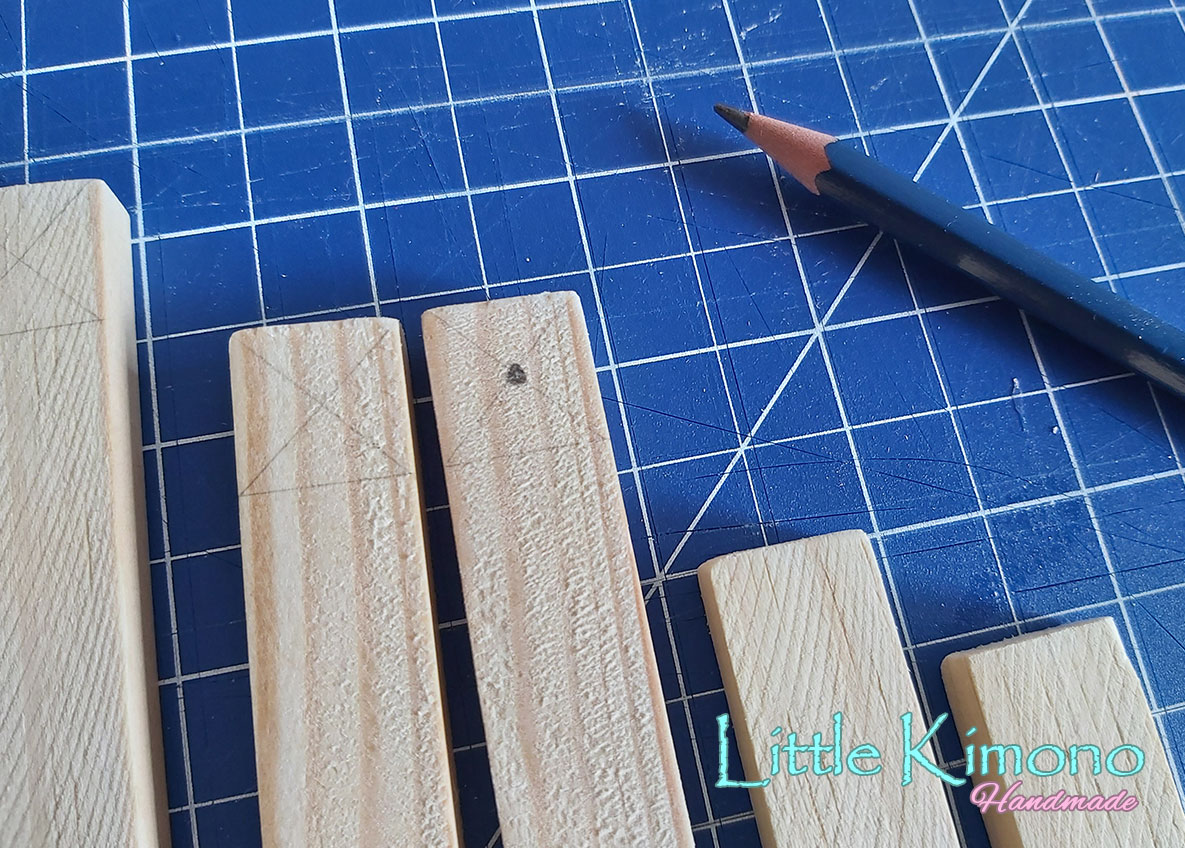 3. Una vez cortadas todas las piezas, en uno de los extremos de cada listón (sólo en las piezas de 22cm lo haremos en ambos extremos) vamos a sobreponer otro listón y marcar el ancho con un lápiz, una vez hecho esto haremos una «X» en medio, en el punto central haremos los agujeros para pasar los tornillos como muestran las imágenes.