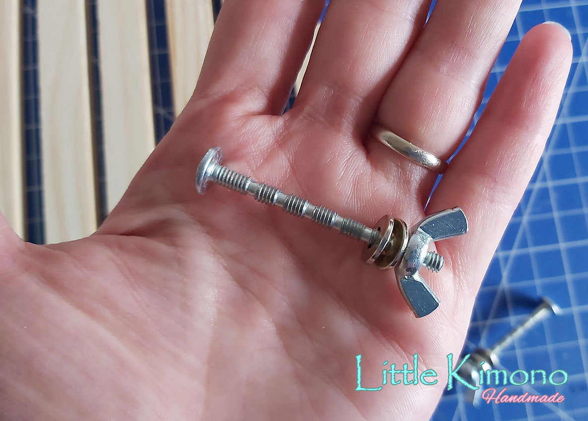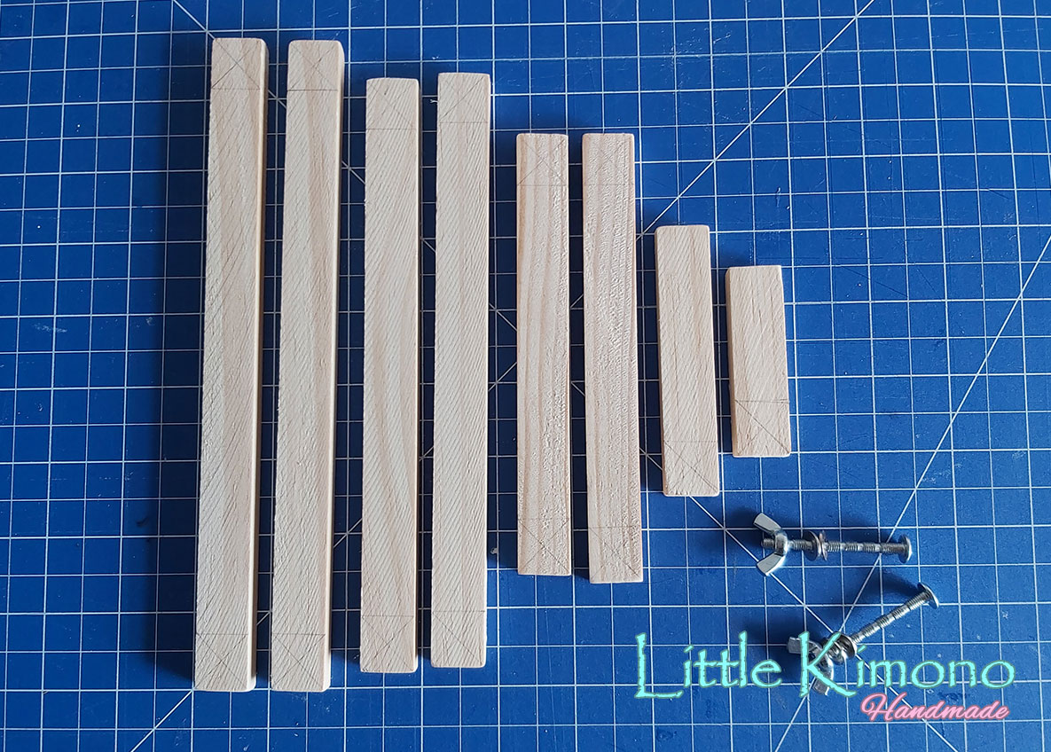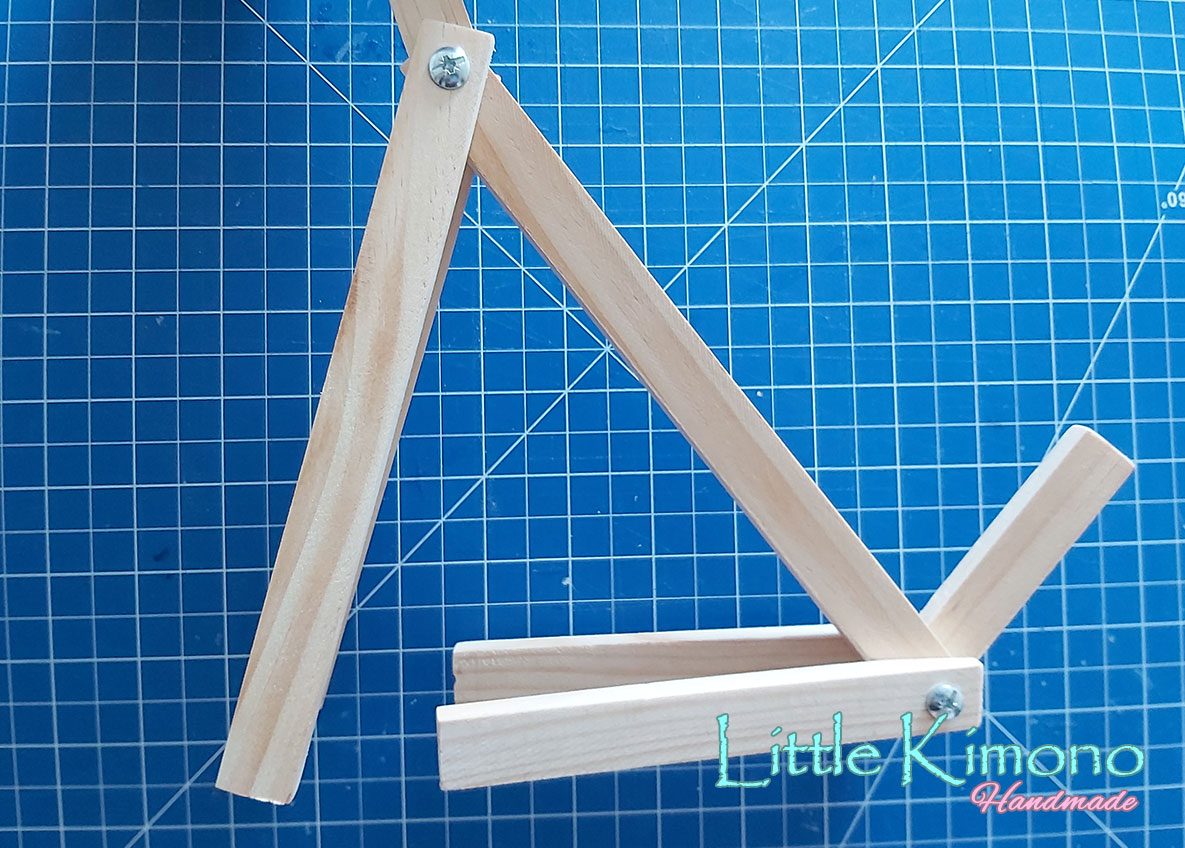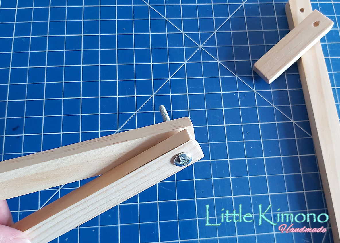 a las piezas de 20cm y 15cm (las de las patas) les quité un trozo por uno de los lados con la sierra (siempre por el lado de los agujeros) y volví a montar, la parte rebajada va «hacia dentro» a la hora de pasar el tornillo, esto hará que las patitas queden más separadas.