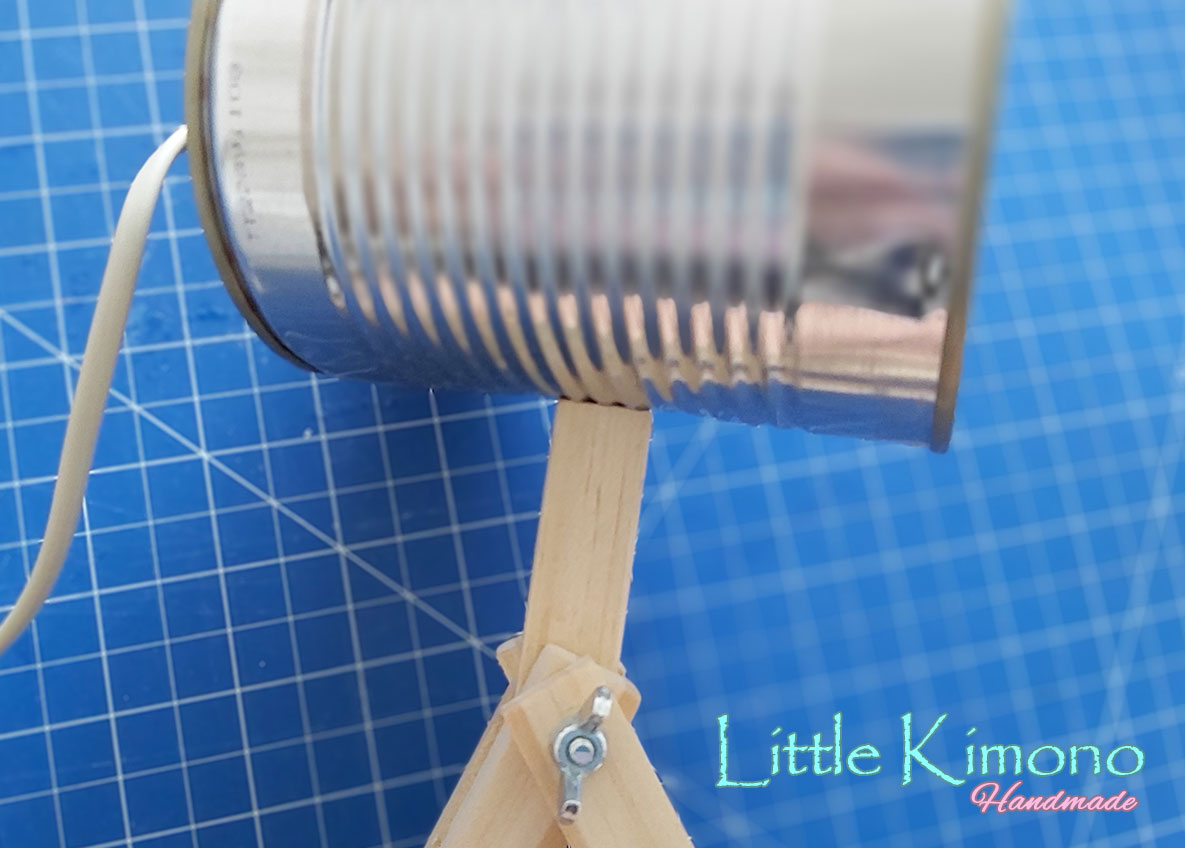 9. Ahora el tornillo pequeño lo pasaremos por la lata de dentro hacia afuera, buscando el centro de la lata, una vez lo hayamos pasado enroscamos al listón de 6cm (el cuello).