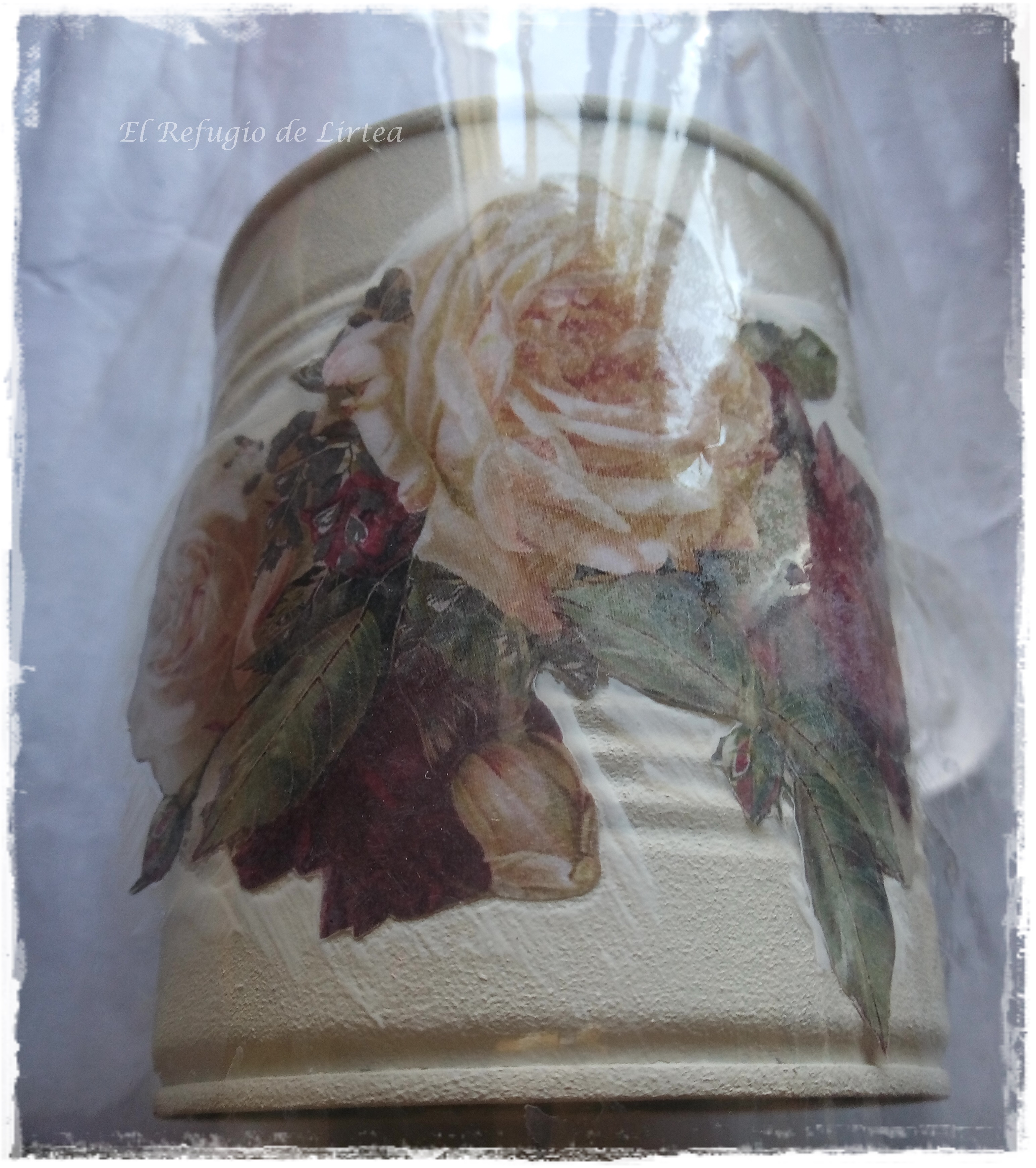 El decoupage sobre las latas queda especialmente bonito al notarse los relieves de la lata,pero hay que asegurarse bien de que el papel queda bien pegado.