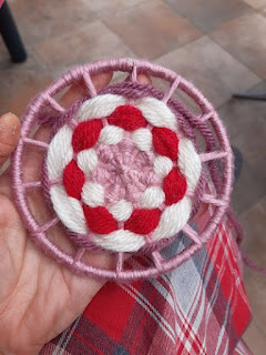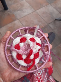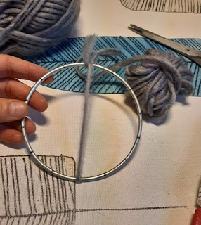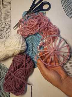 Esta vez en lugar de hacerlo con palos lo hemos hecho sobre un aro de metal de unos 11 cm que creemos que es de alguna pantalla de lámpara que se nos rompió y a sabéis que aquí no se tira casi nada ;-D