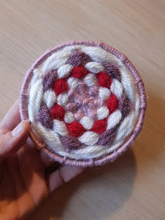Una vez ya tenemos la estructura lista llega el momento de empezar a rellenar nuestro tapiz; trabajo que es de lo mas sencillo y tan solo hemos de ir pasando una cuerda por arriba y otra por debajo a lo largo de todo el aro hasta hacer la figura que deseemos y con los colores que hayamos elegido.