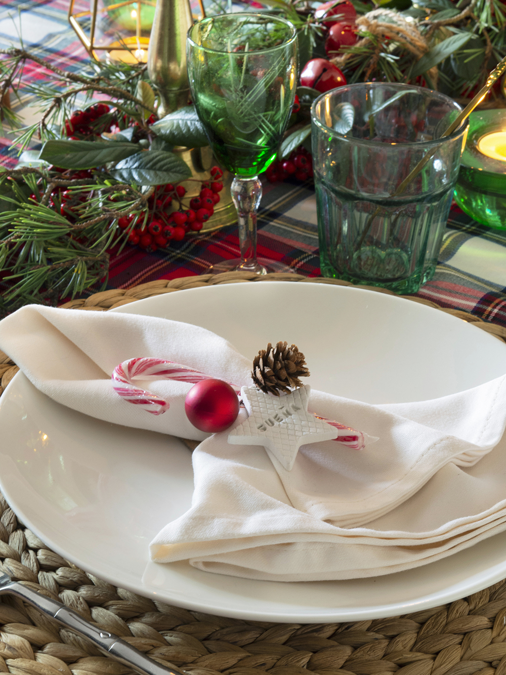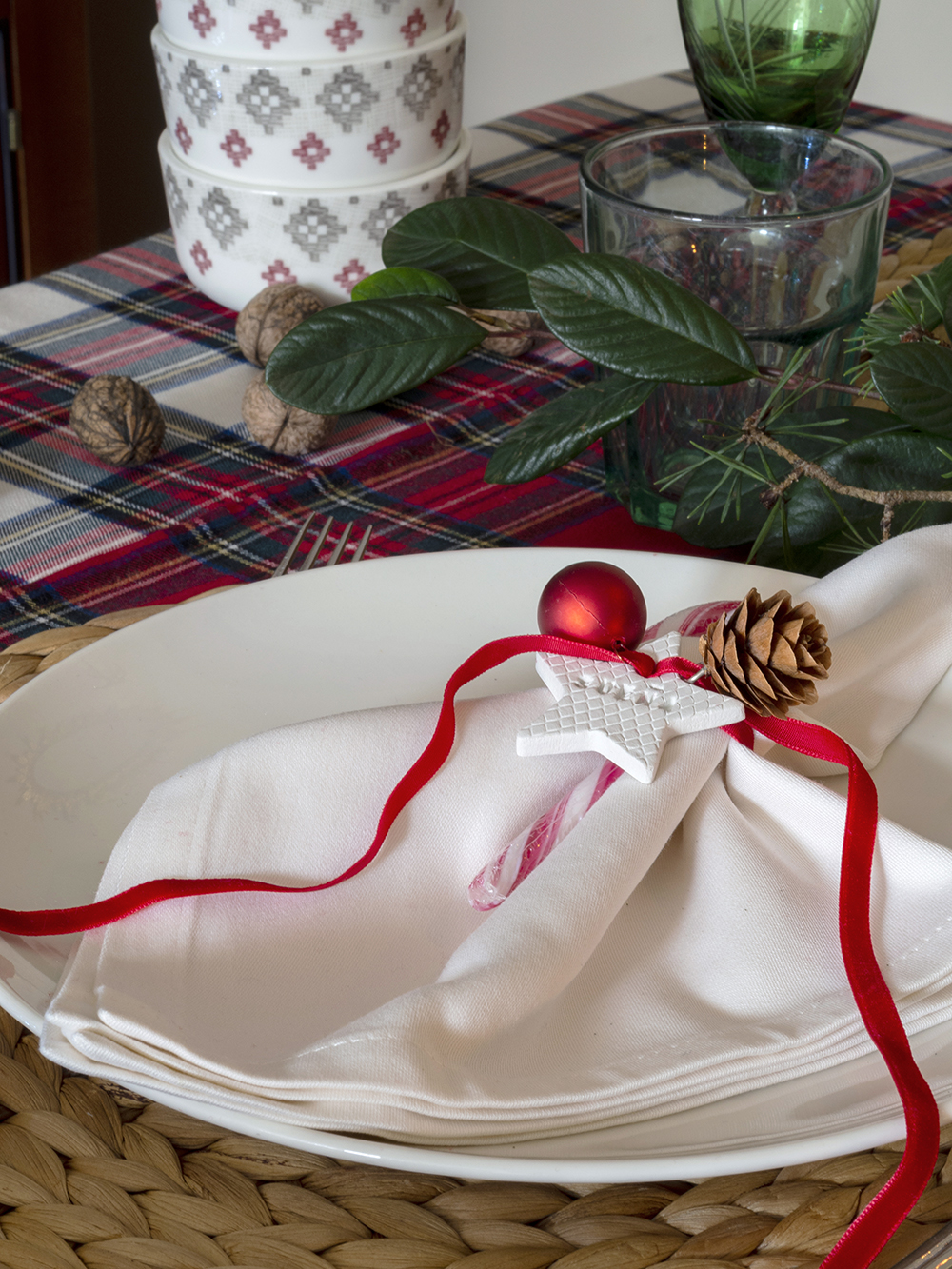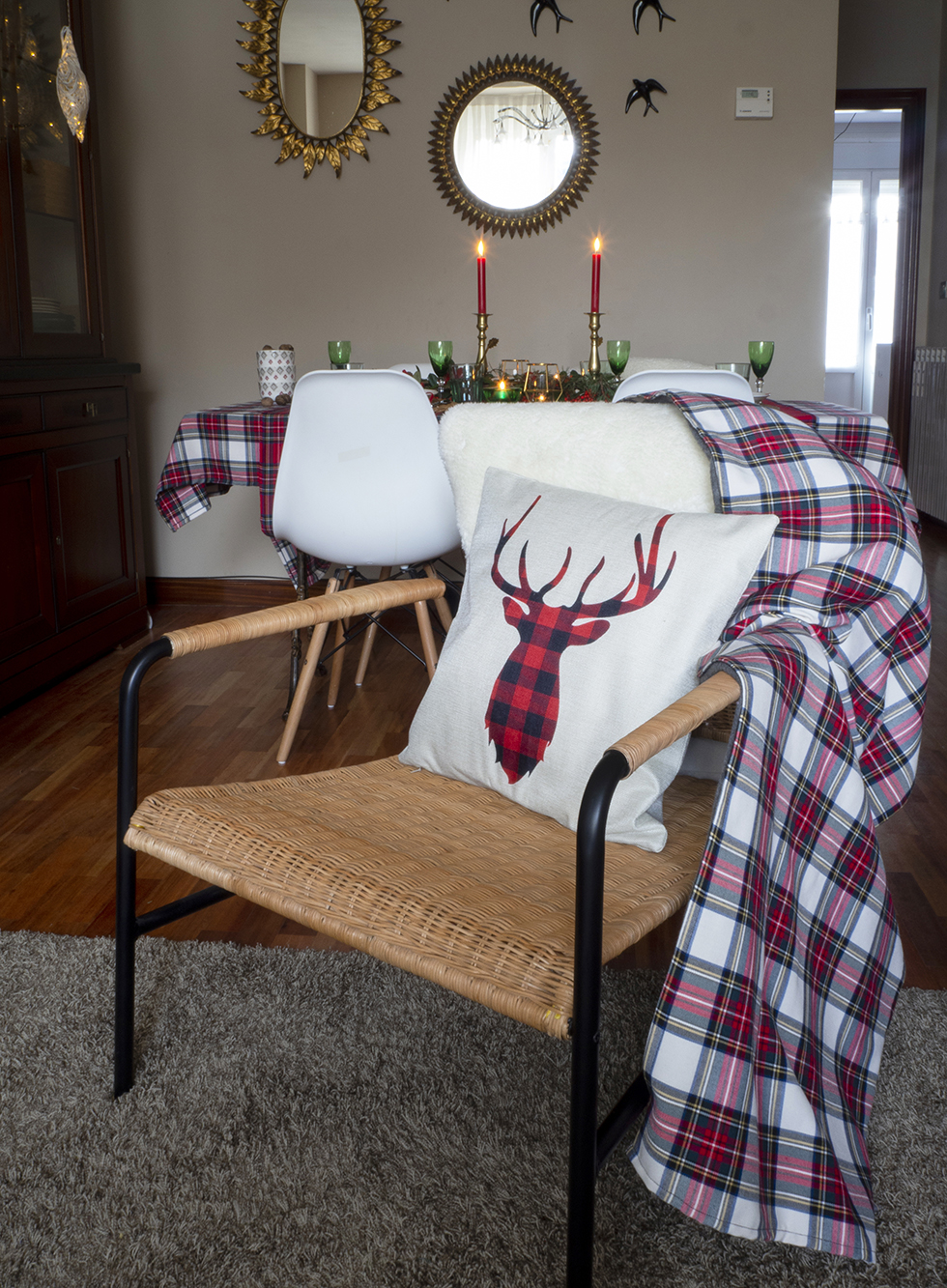 Texturas naturales: Mimbre, madera, rafia,… Los elementos naturales aportan calidez y encajan a la perfección con los cuadros escoceses para lograr esa estética navideña-hogareña que buscamos. Podéis introducir estos materiales con los bajo-platos como hemos hecho aquí, en posavasos de rodajas de madera, en paneras de mimbre, bandejas o tablas de madera, etc.