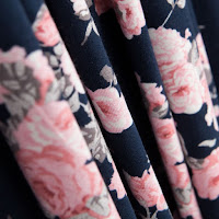 🌸 La siguiente es esta tela de viscosa estampada en tonos azul marino y rosa para un vestido.
