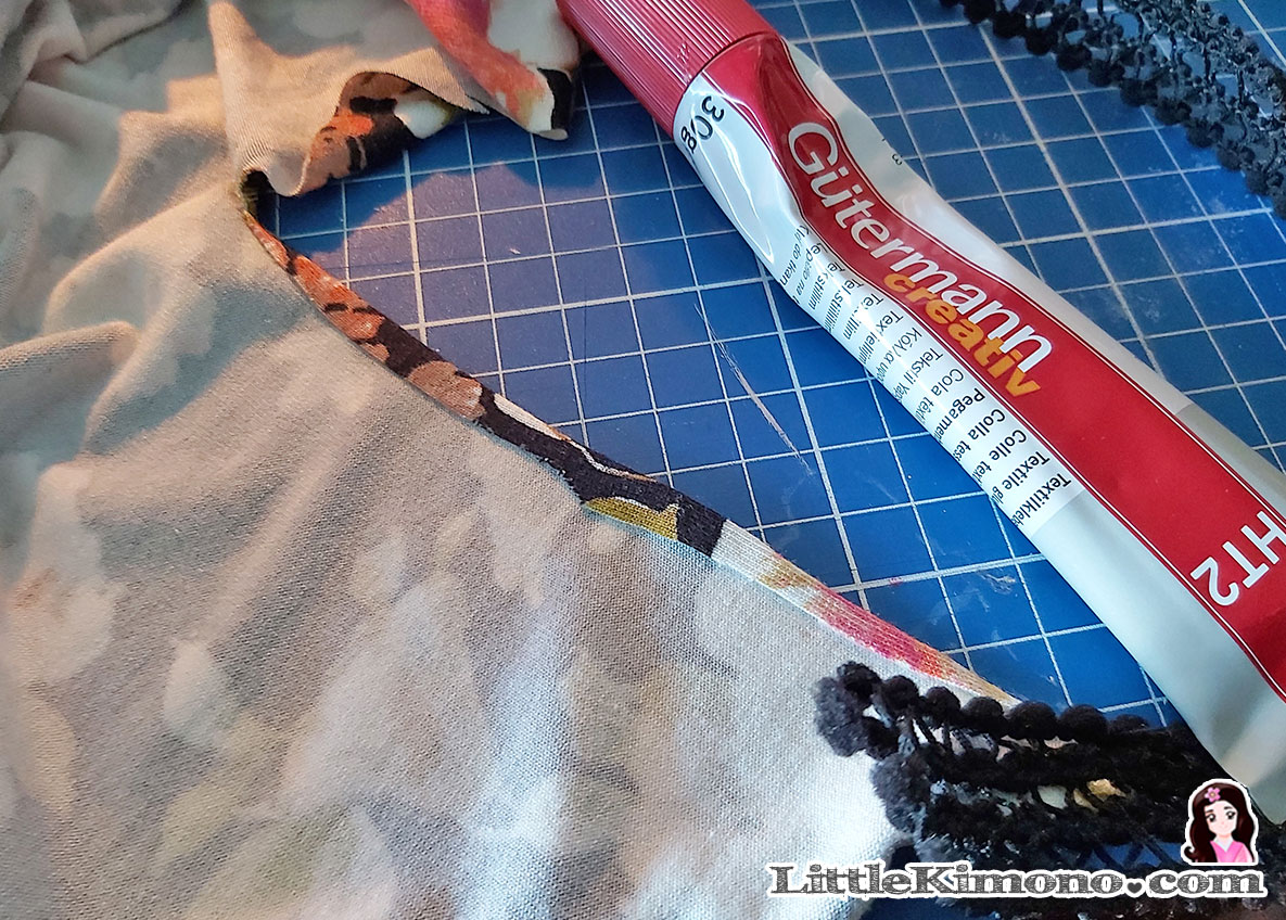 7. Pegamos o cosemos ya sea a máquina o con puntadas a mano y si queremos podemos pegar los bordes de los dobladillos o dejarlos tal cual, como os dije es una tela que no deshilacha, así que podría quedarse así, yo los hice con pegamento textil y pegué en el frente un lazo de la misma tela^^