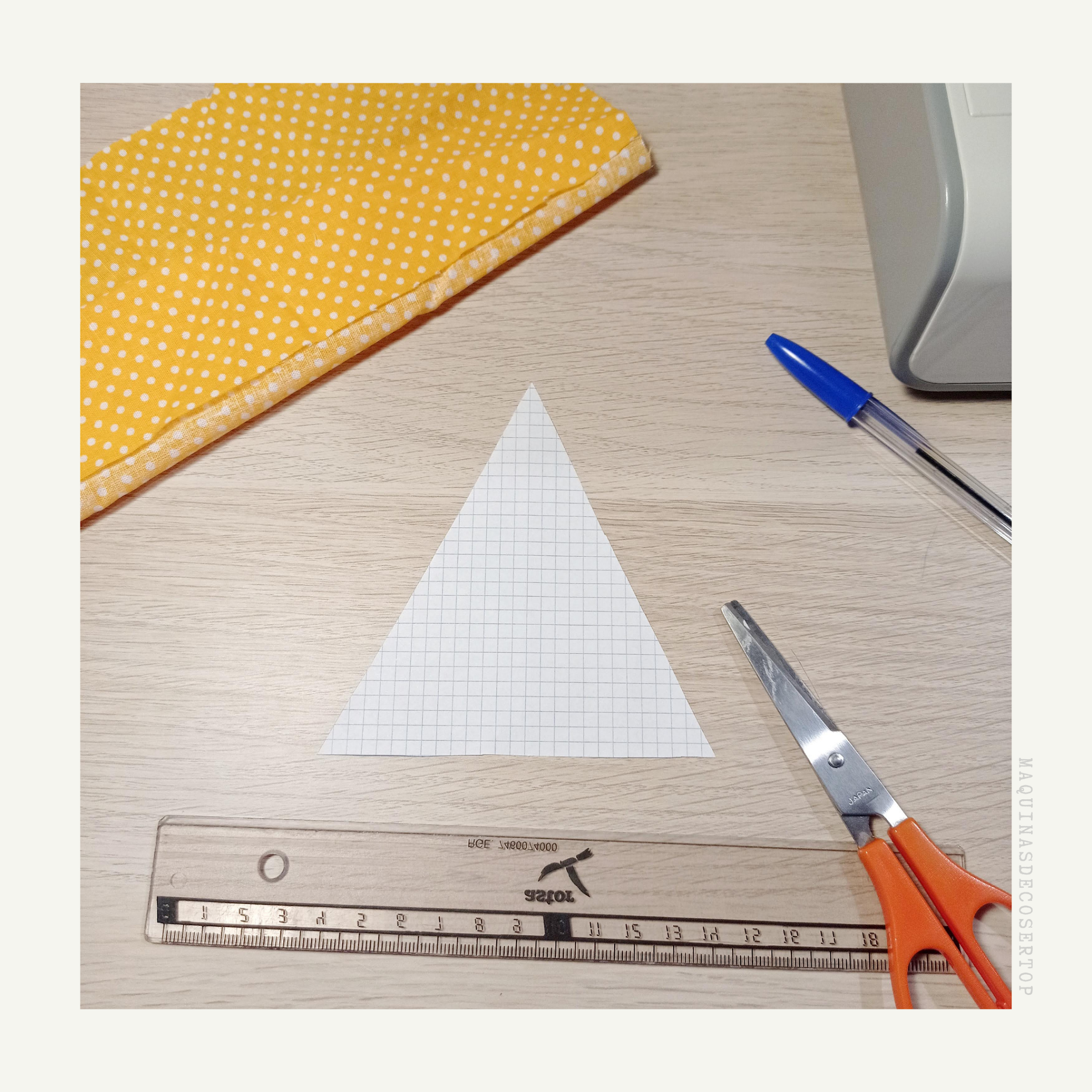 * Primero crear el triángulo a la medida que queramos. Ten en cuenta que debes dejar algunos centímetros laterales para que tengas espacio por dónde coser.
