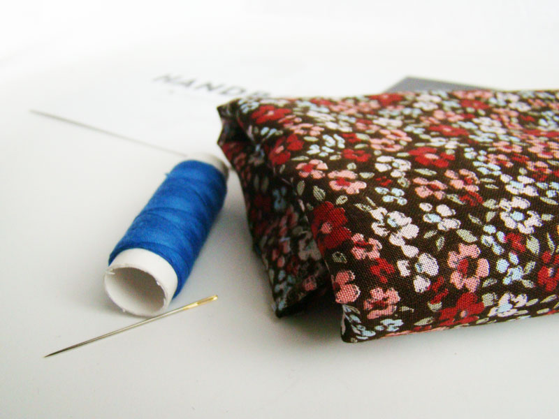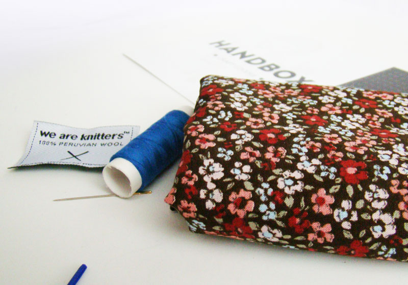 * Minikit de personalización de Handbox: tela estampada de 34 x 68 cms, aguja, hilo, alfileres.
