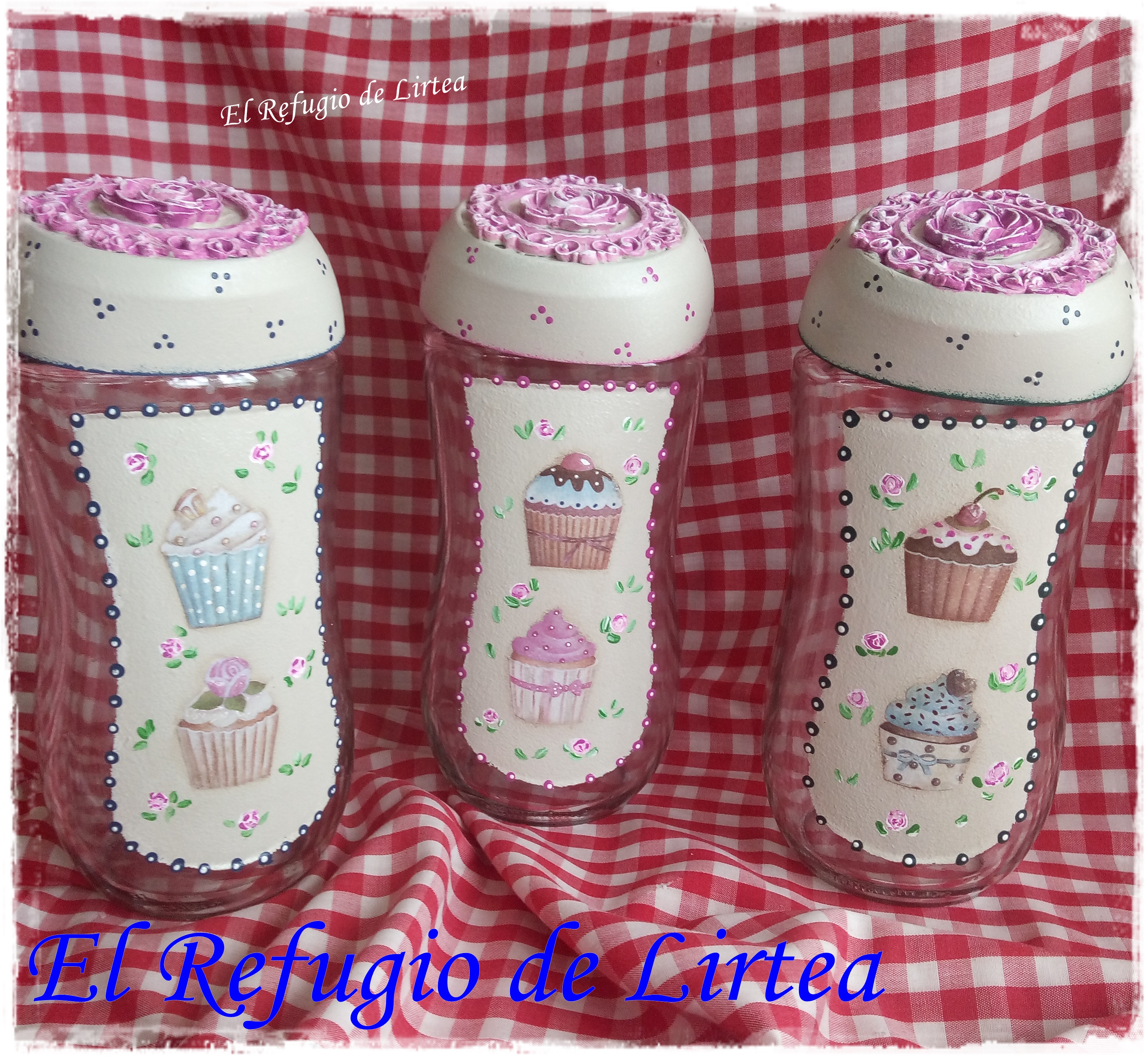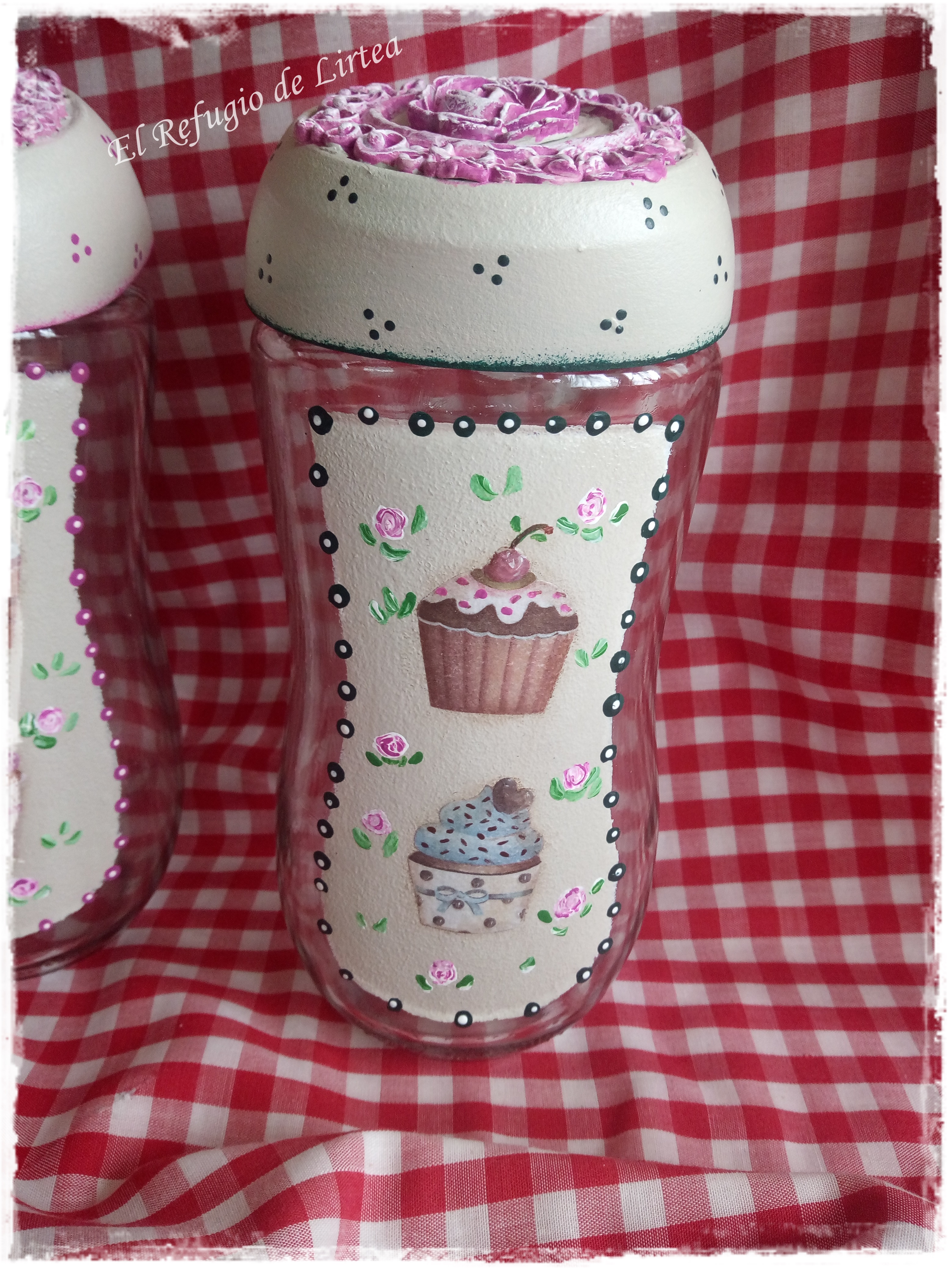 Estos botes primero llevan una capa de gesso blanco, luego pintura chalky en color crema, decoupage con papel decoupage, puntillismo y pequeñas rosas pintadas a mano alzada.