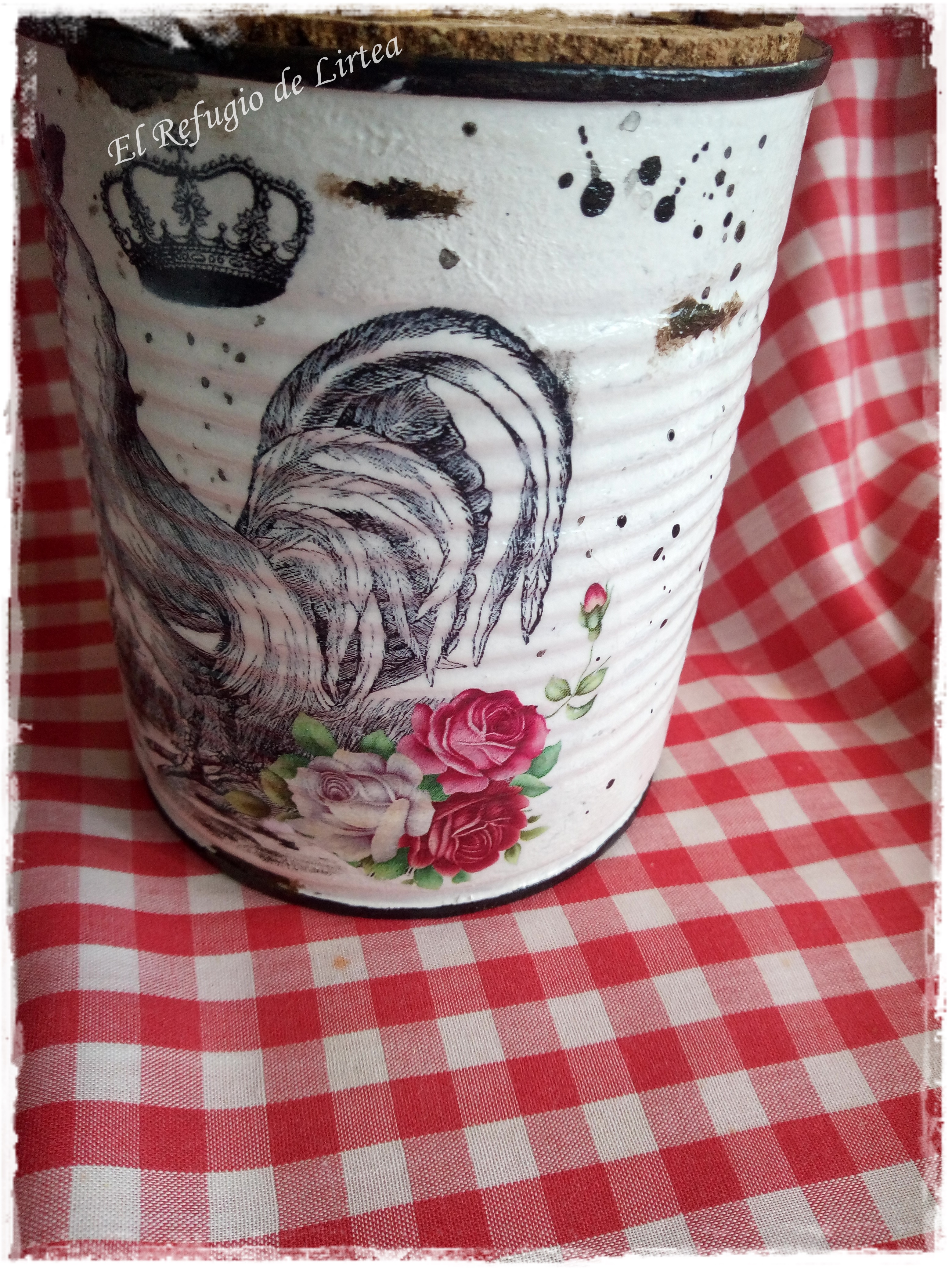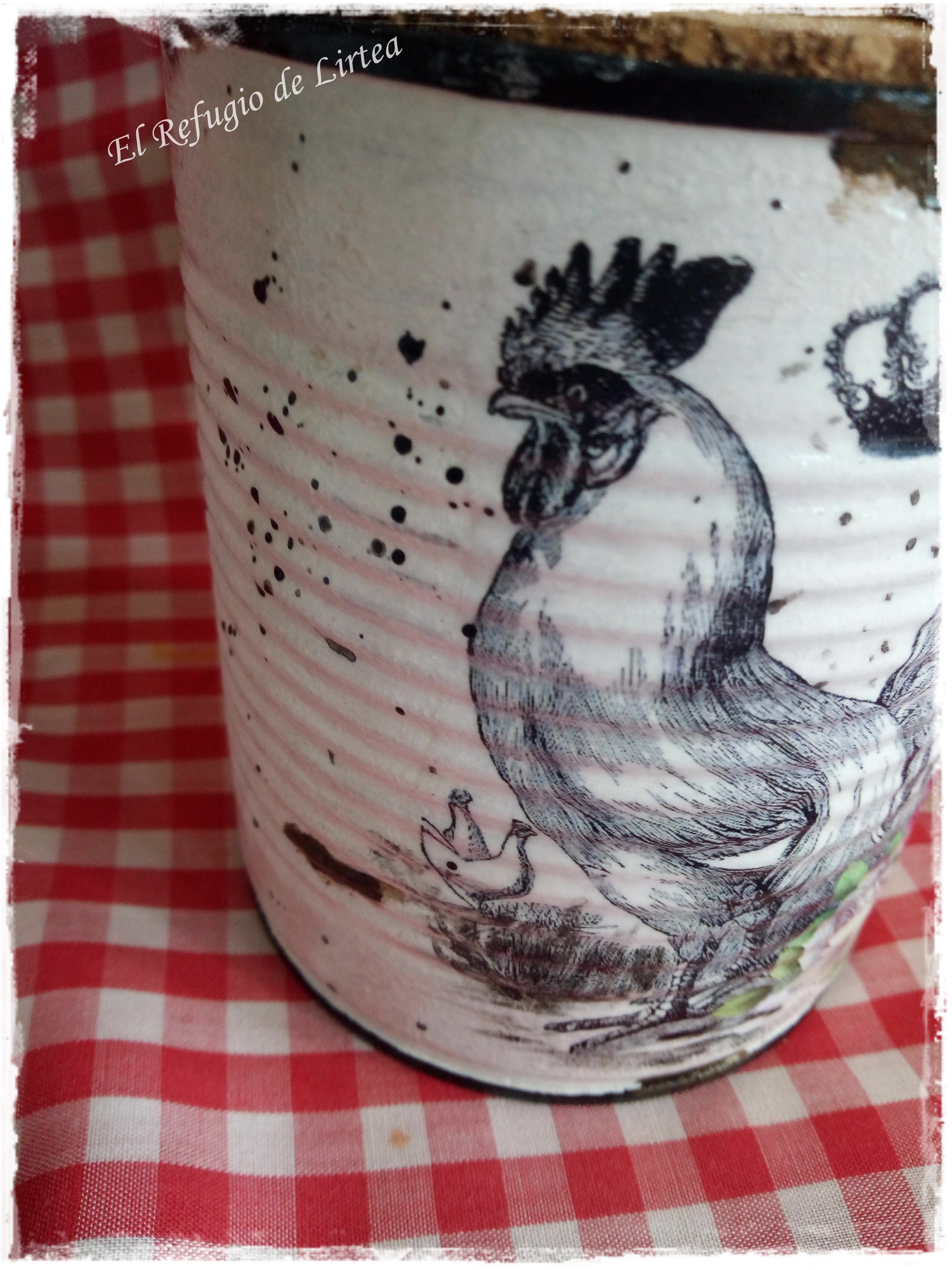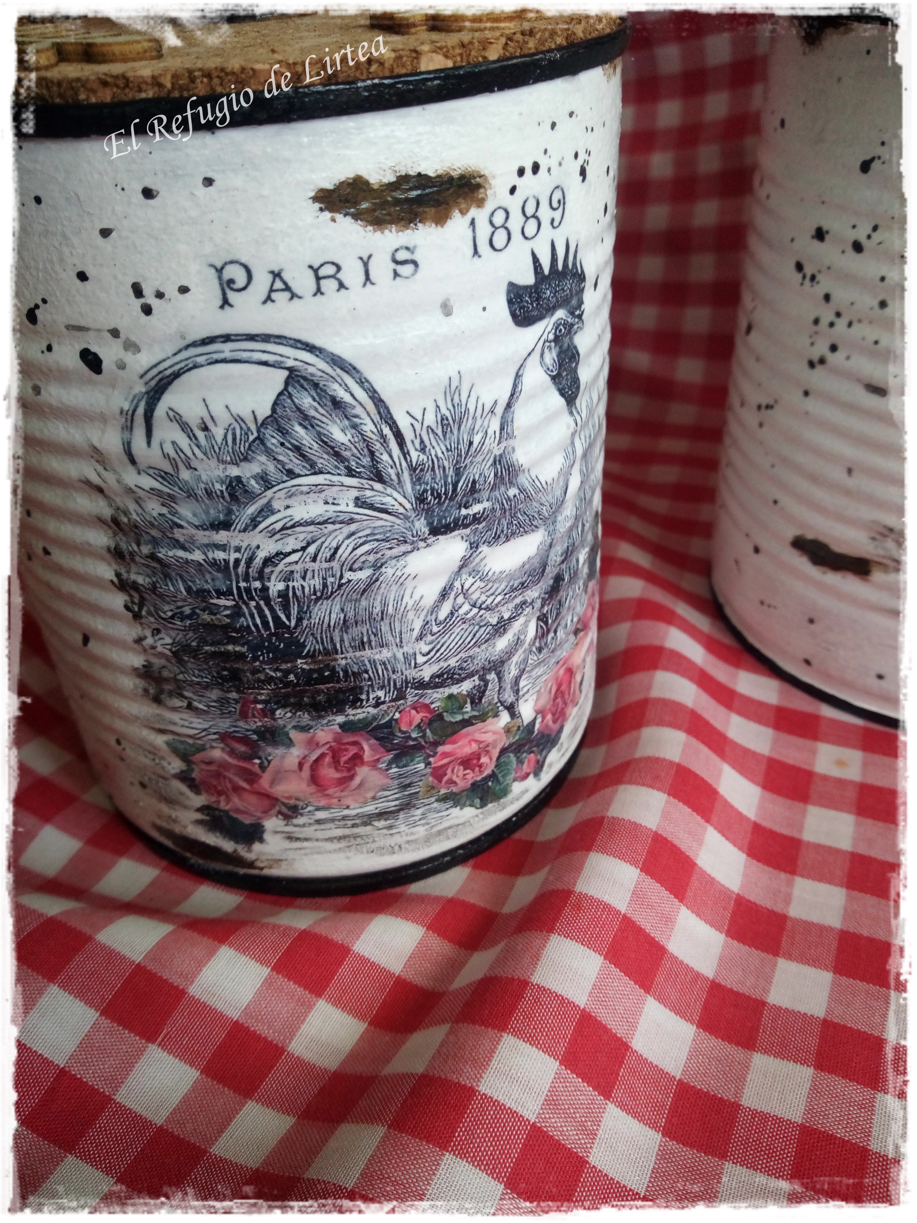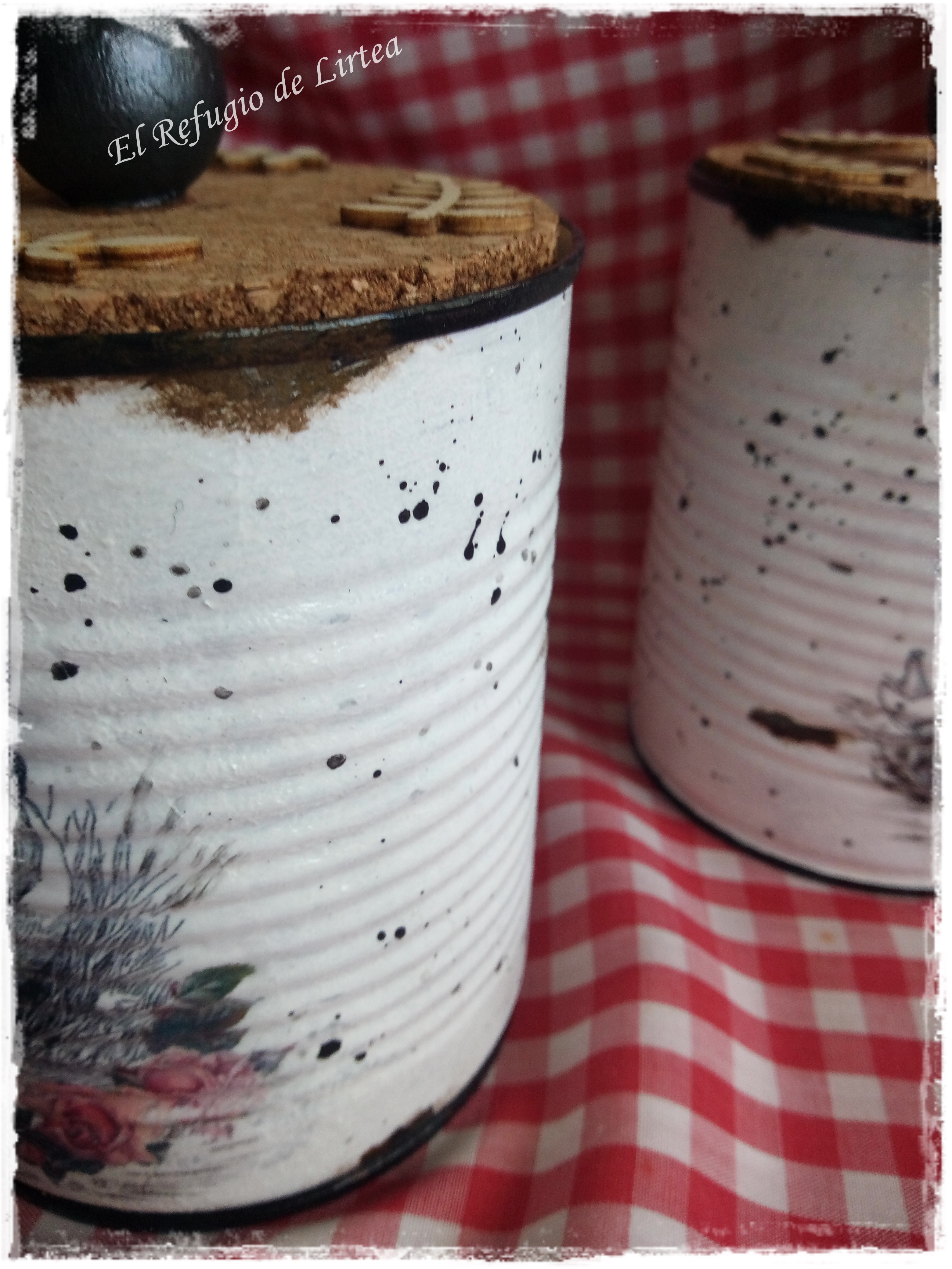 Son dos latas de conservas de 1 kgr. que he decorado con tranfer y les he dado un aspecto enlozado y desconchado.